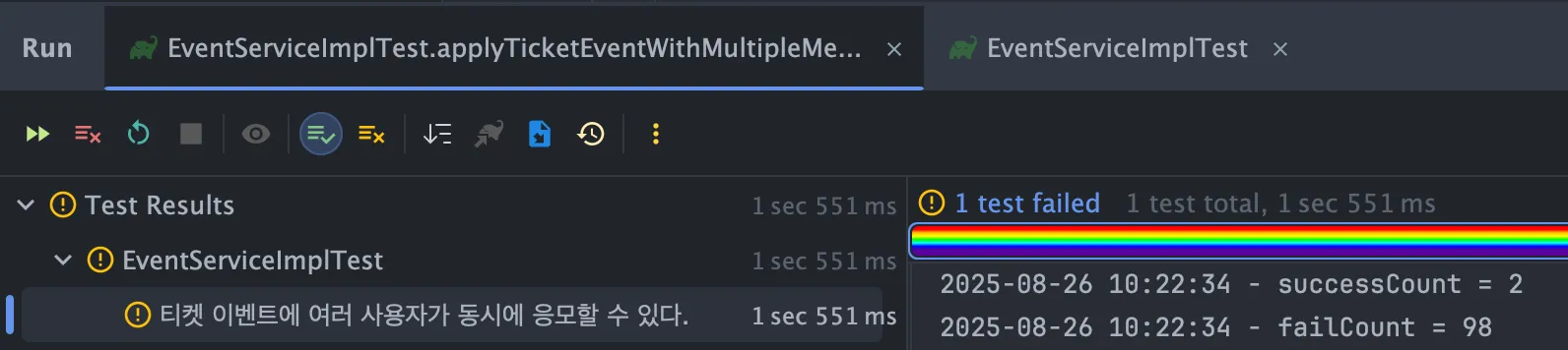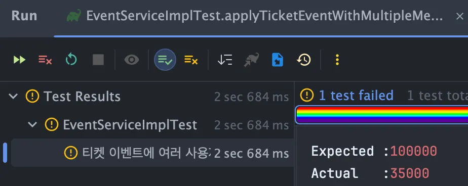 applyTicketEvent은 단순 반복 루프를 가지고 있는 메서드이기때문에 트랜잭션을 붙여주지않았고, applyTicketEventOnce에는 트랜잭션을 붙이고, 트랜잭션 전파도 설정해주었다.