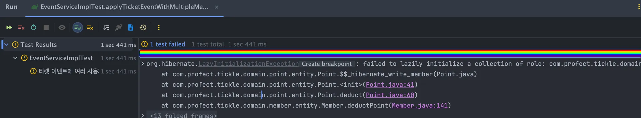 테스트코드에서의 @Transactional을 다시 제거하니 아까와 똑같이 Point부분에서 지연로딩 에러가 뜨는 것을 확인할 수 있었다. 도대체 왜 뜨는걸까?