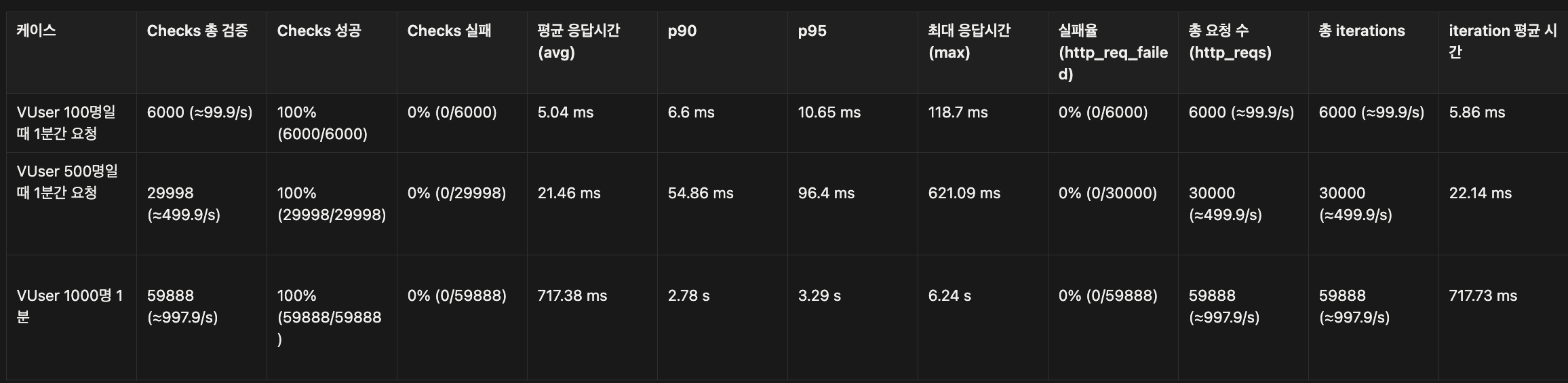 1차 테스트를 거쳐 동시 요청 사용자(VUser)가 1000명일 때 까지, 목표 응답시간과 에러율 등을 만족할 수 있었다.