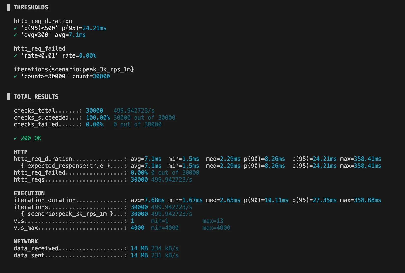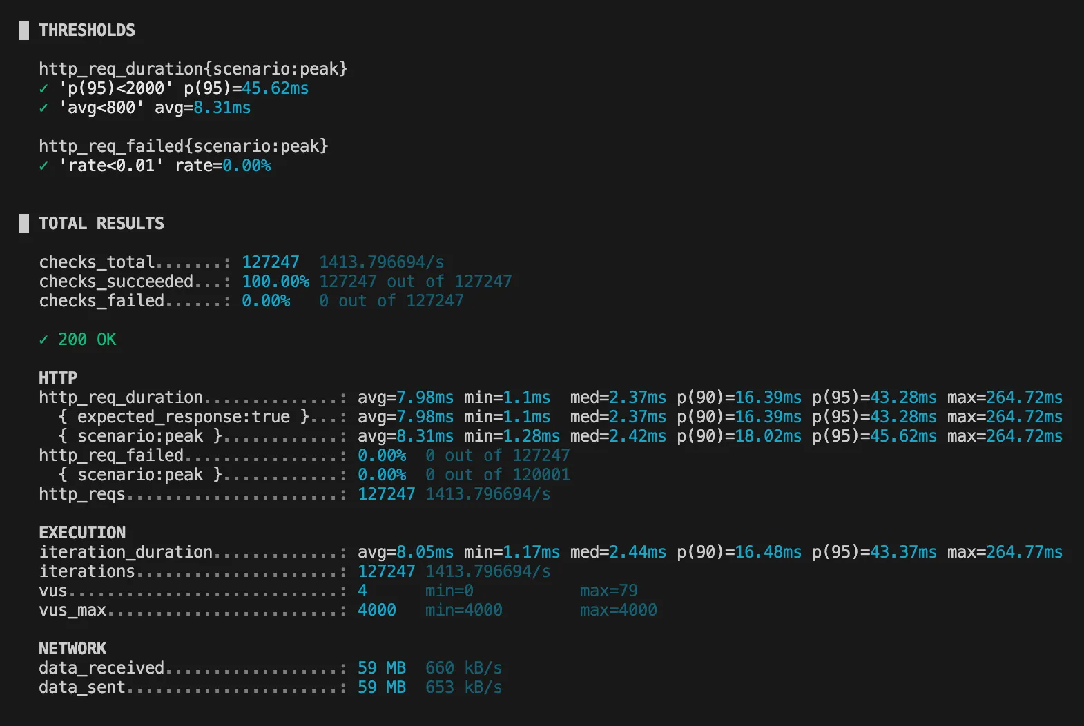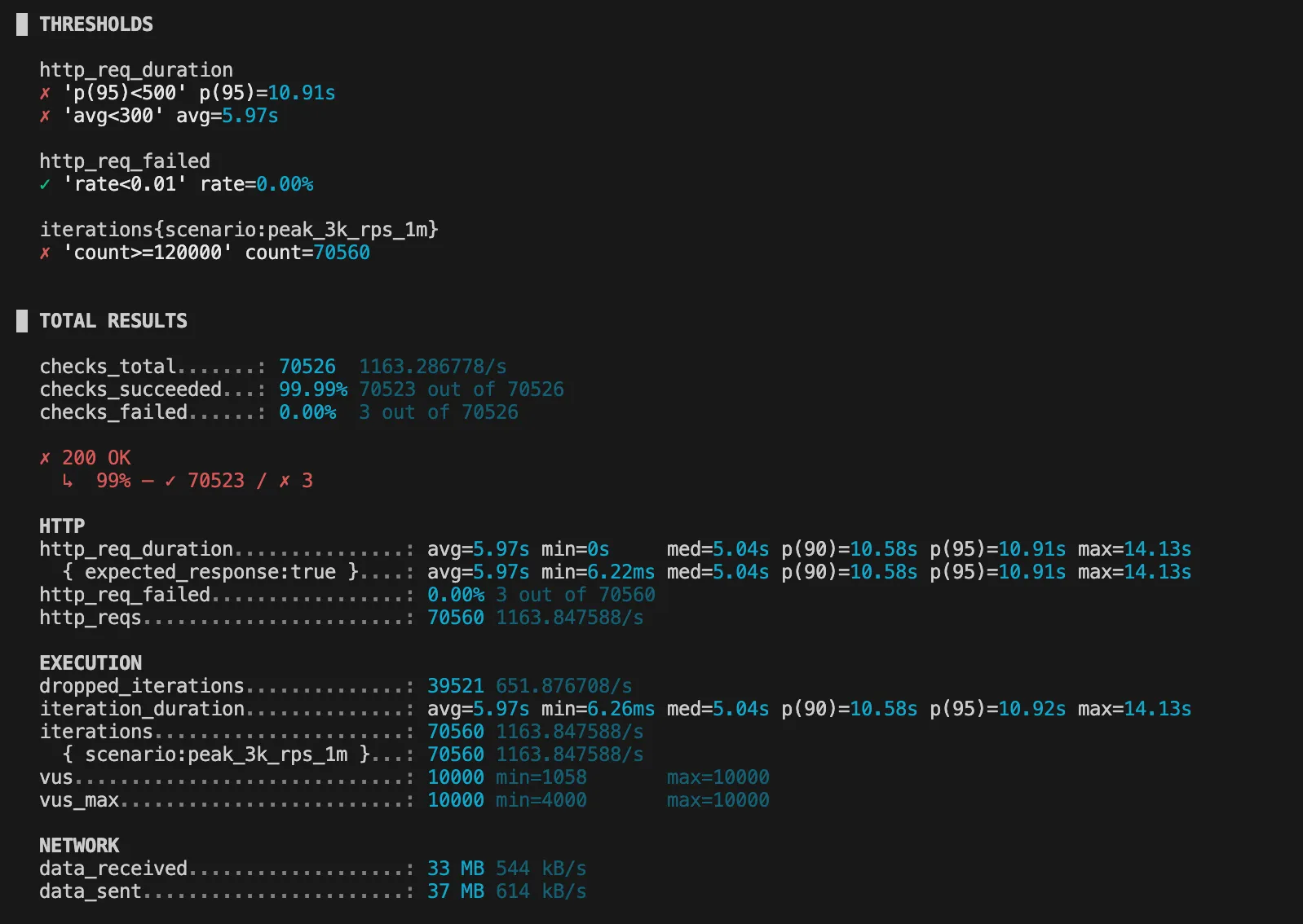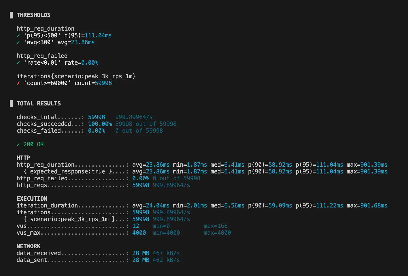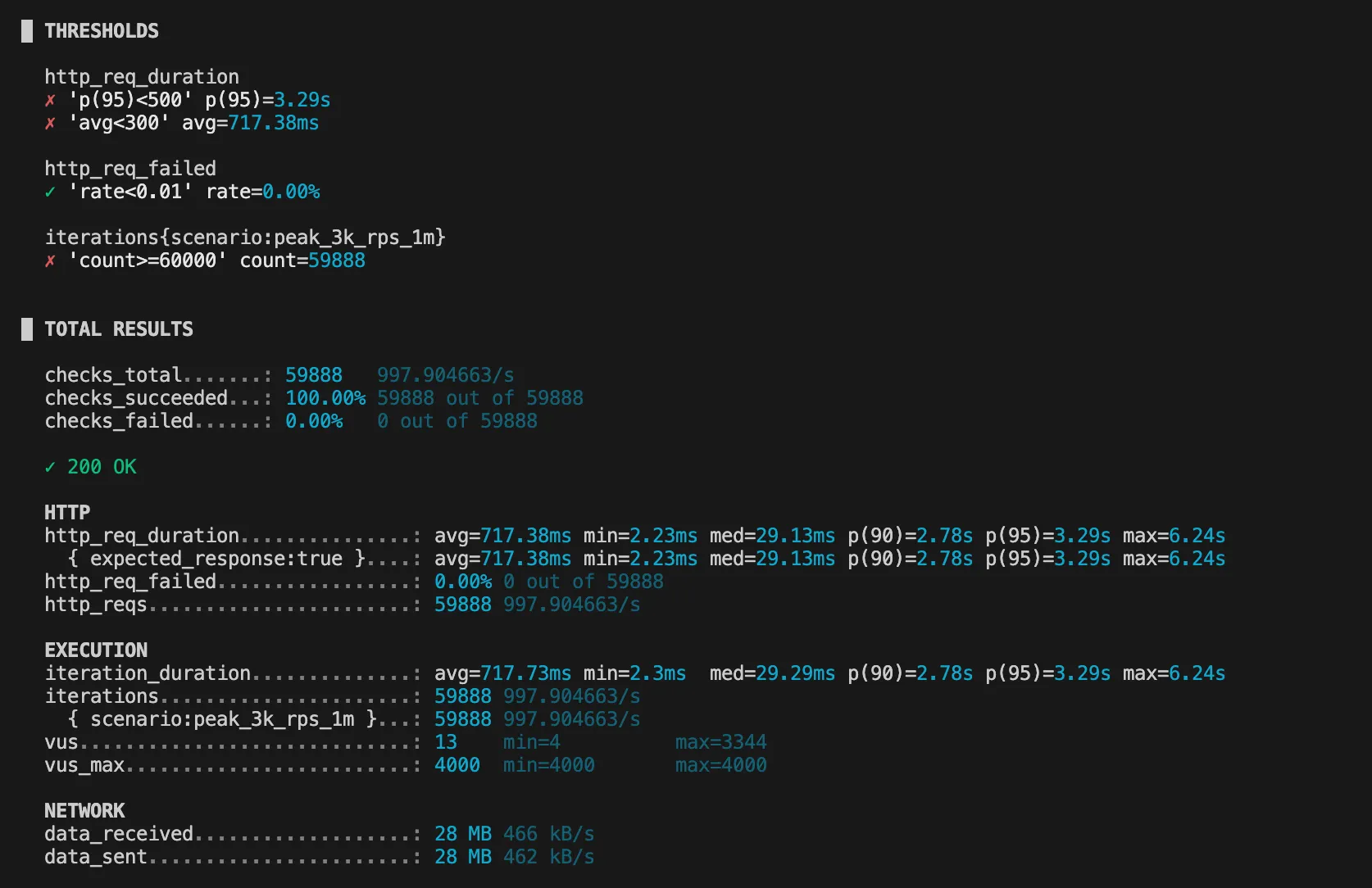 1000 VU 테스트에서 처리량은 거의 1000 rps 달성했지만,