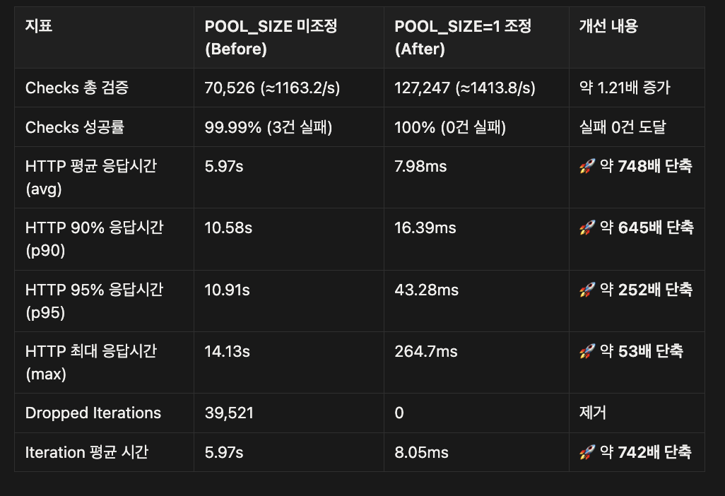- 대량 동시 접속 시 커넥션 경쟁 병목 제거 → 평균 응답 시간 수백 배 향상