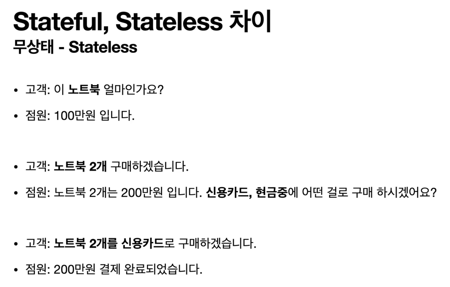- Stateless: 중간에 다른 점원으로 바뀌어도 된다.(고객이 필요한 데이터를 그때그때 다 넘기기 때문)