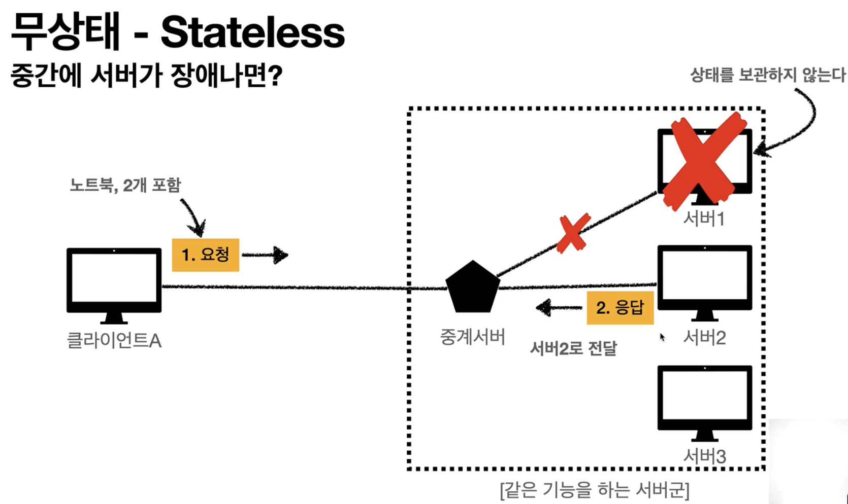 - 무상태는 응답 서버를 쉽게 바꿀 수 있다 --> "무한한 서버 증설 가능"