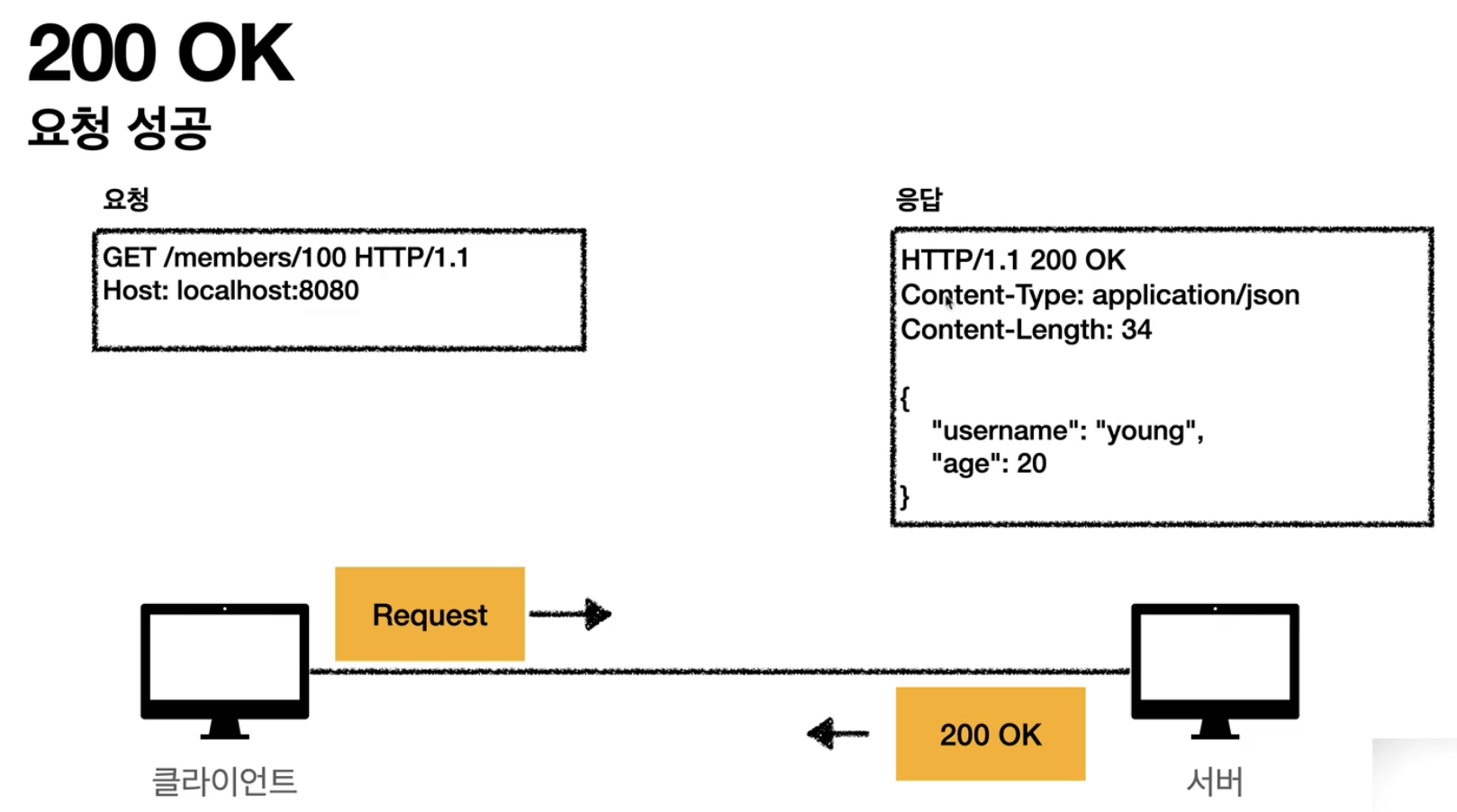 클라이언트가 GET으로 /members/100번 리소스 주라고 요청하면 서버에서 결과를 정상적으로 처리해서 응답함