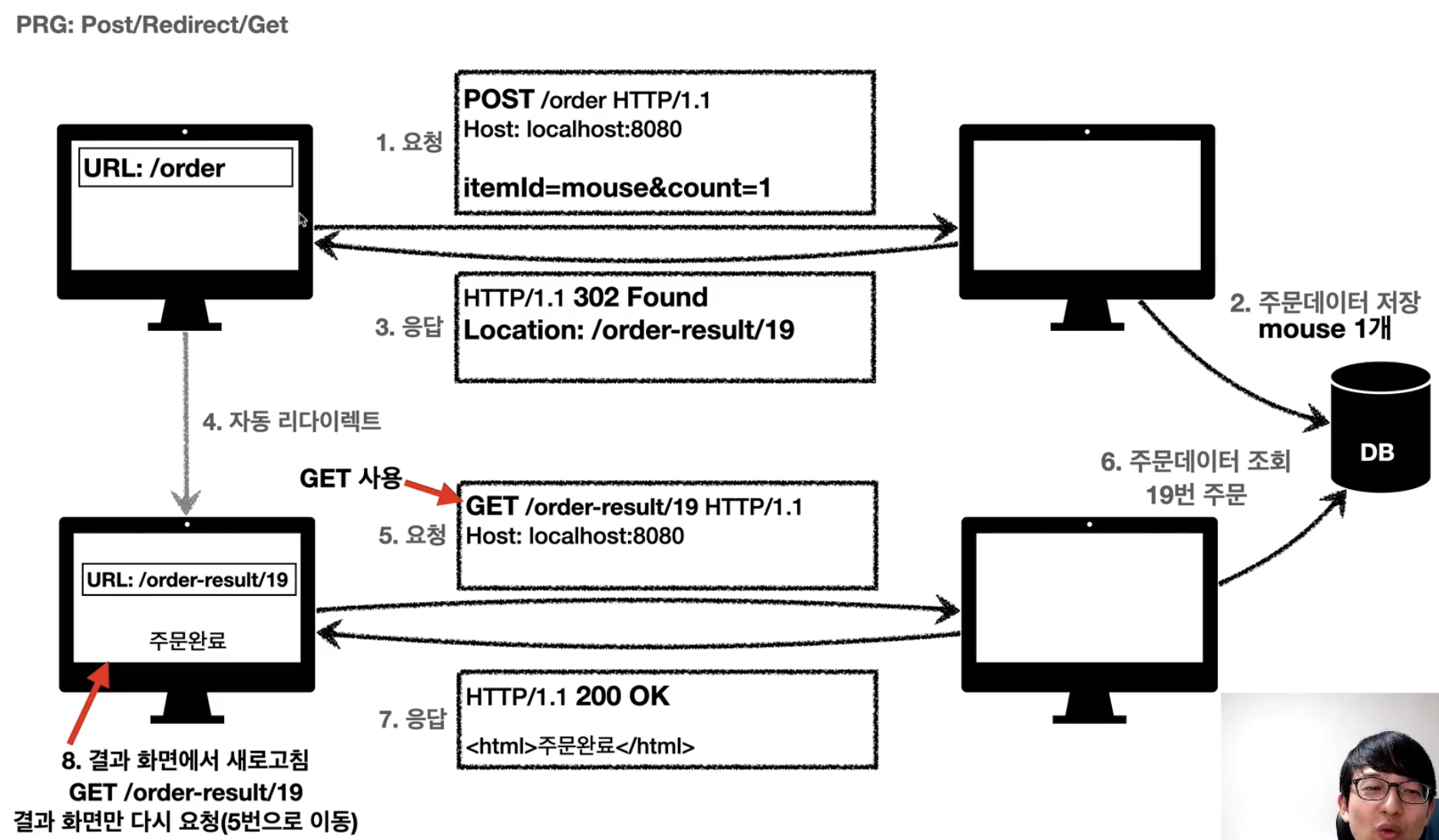 그때 302면 POST를 GET으로 바꾸고, 주문 데이터를 쌓는것이 아니라 주문데이터를 조회하고 html 화면을 만들어 200 OK를 보낸다.