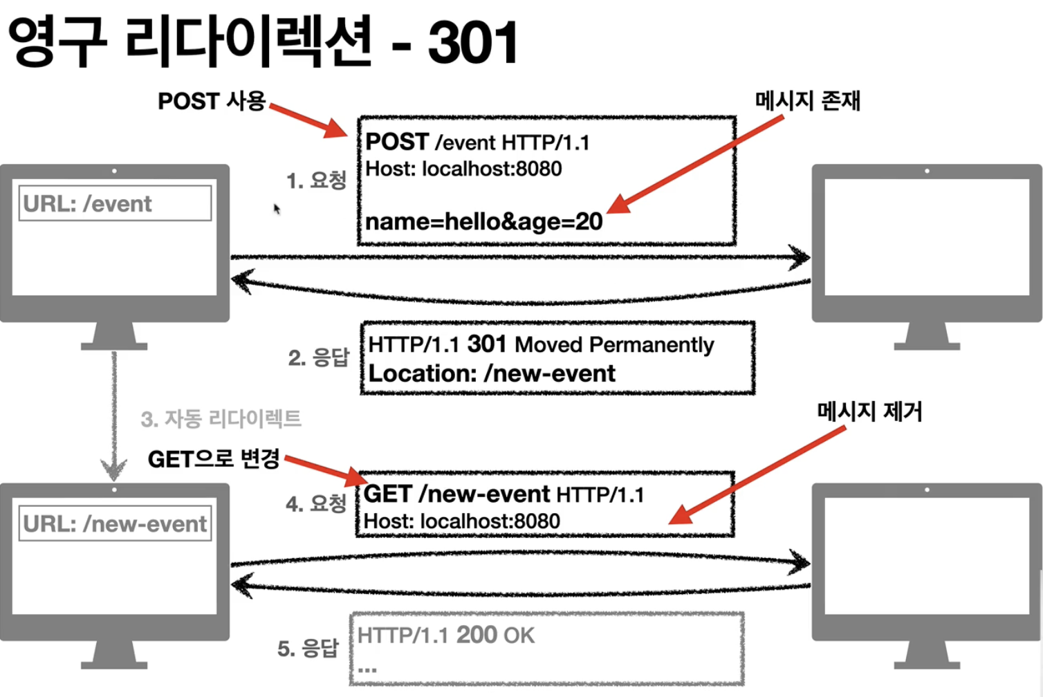 - 리다이렉트시 요청 메서드가 GET으로 변경(확정)