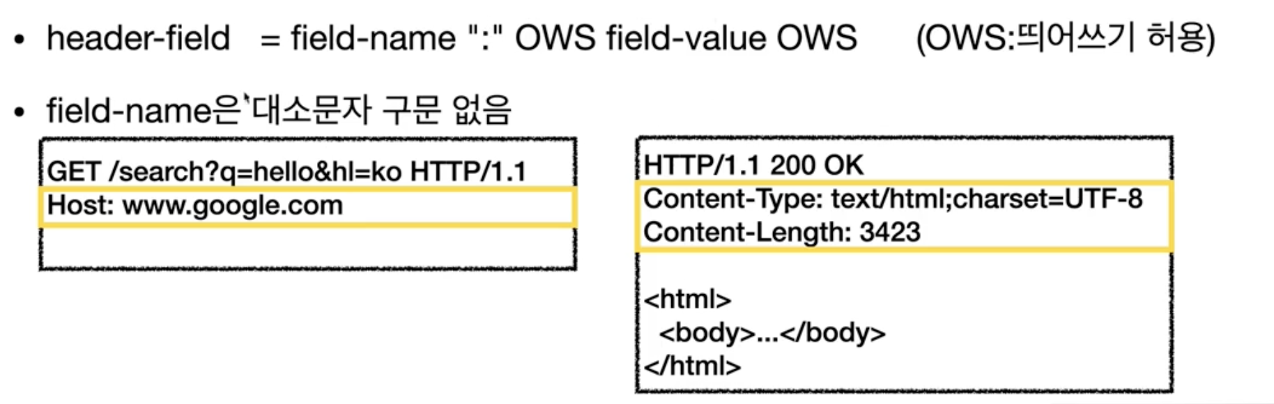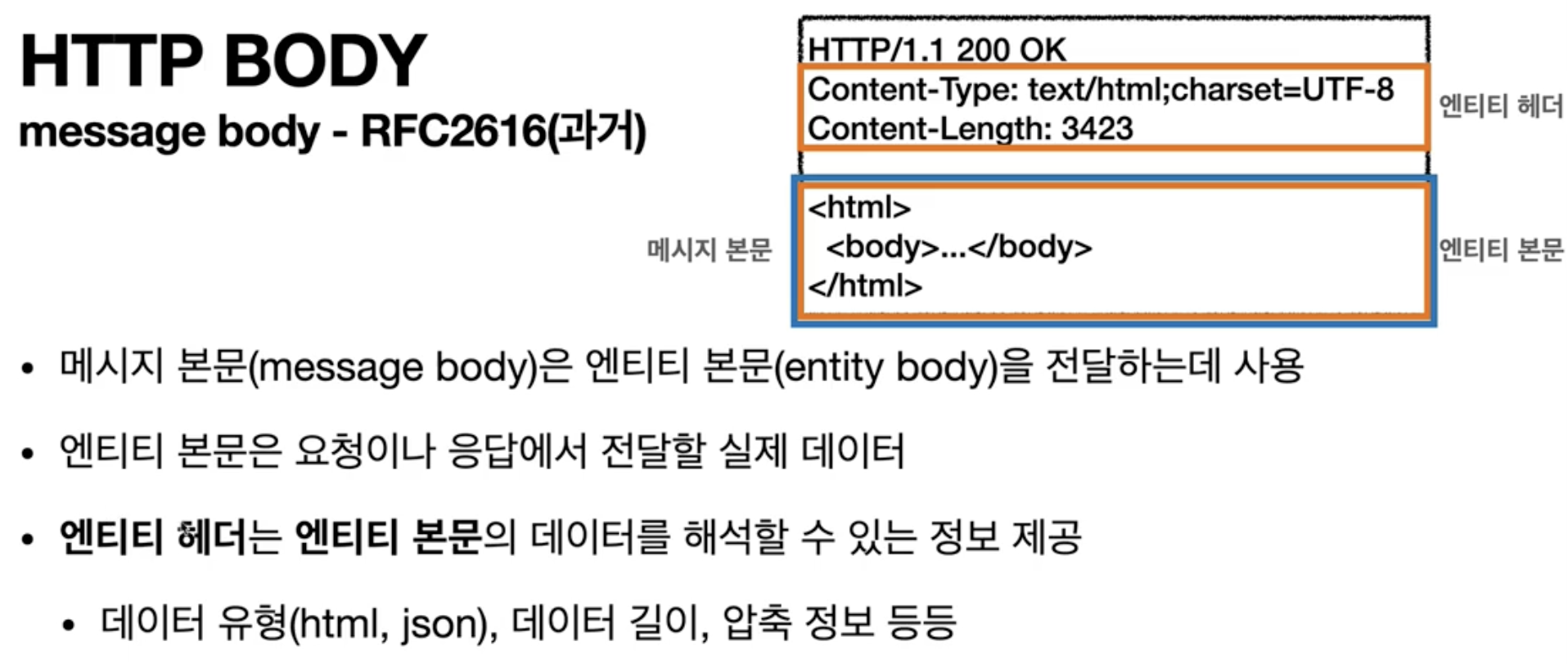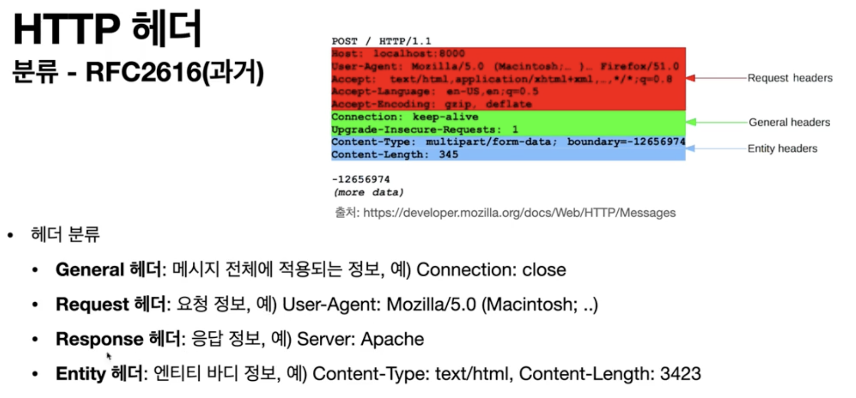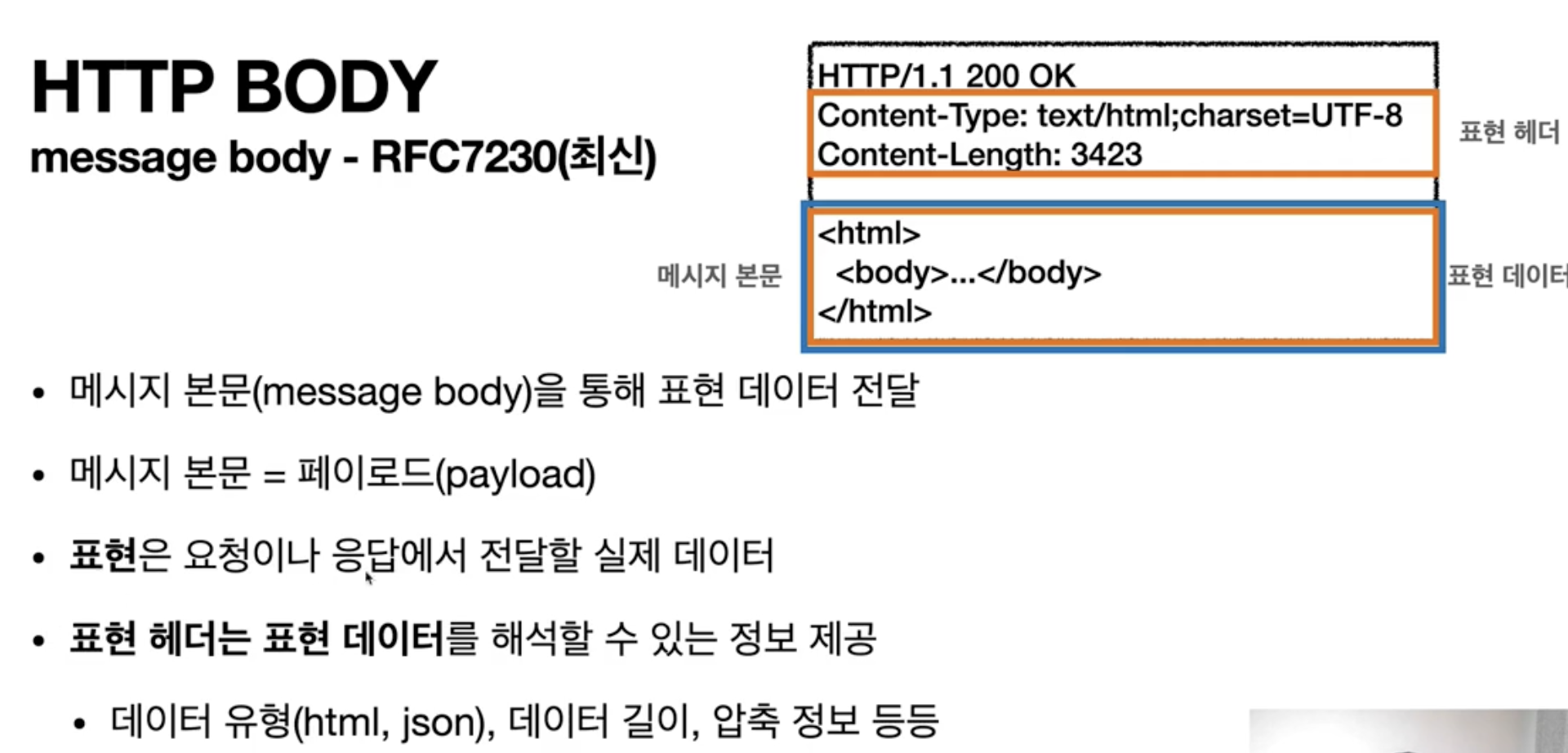 - HTTP 전송에 필요한 모든 부가정보 (ex) 메시지 바디의 내용, 메시지 바디의 크기, 압축, 인증, 요청 클라이언트, 서버 정보, 캐시 관련 정보 등등 . . .