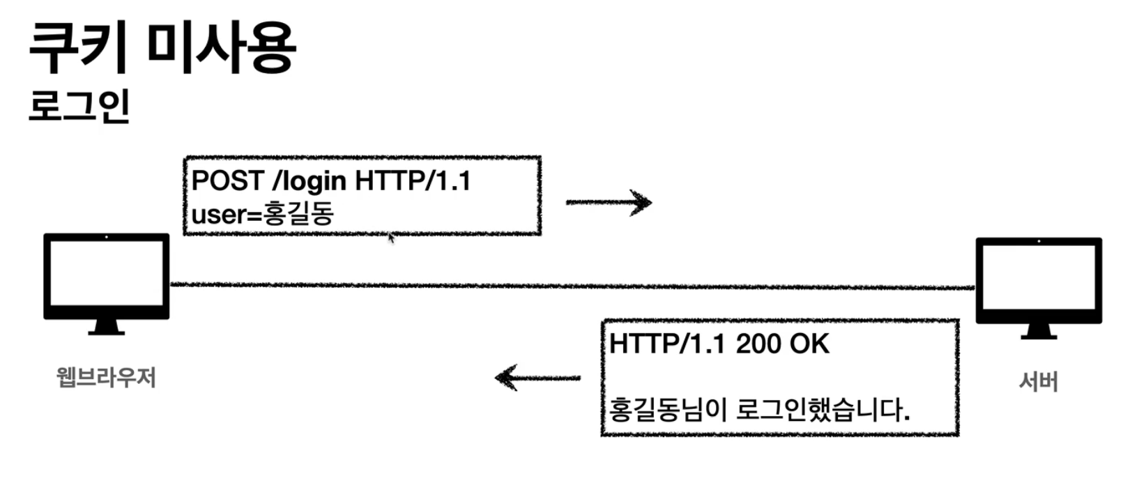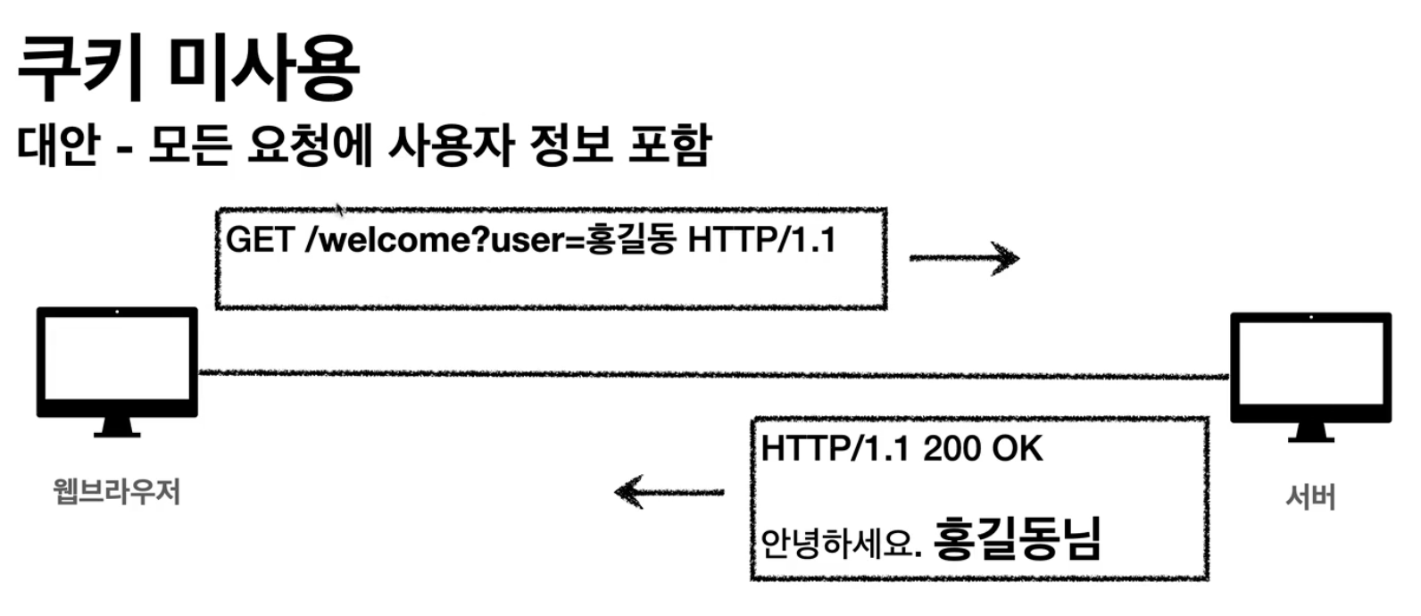 HTTP는 무상태 프로토콜이다. 요청과 응답을 주고 받으면 바로 연결을 끊어버리기에 유저가 홍길동인지를 알 수 없다.