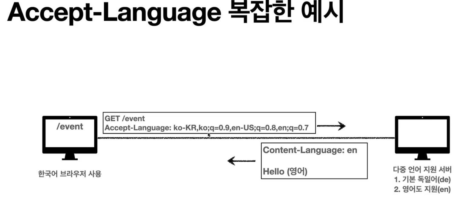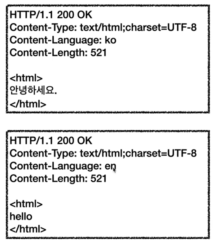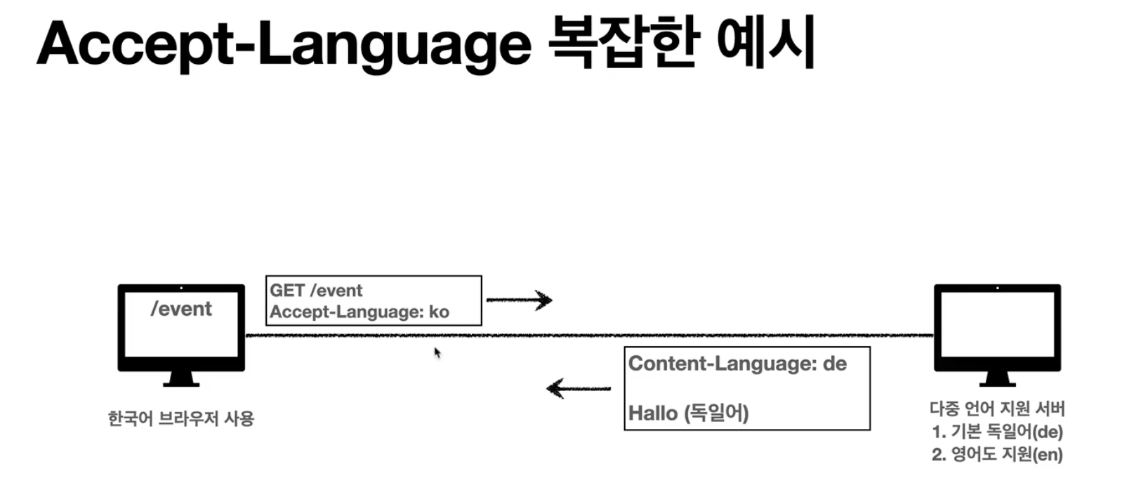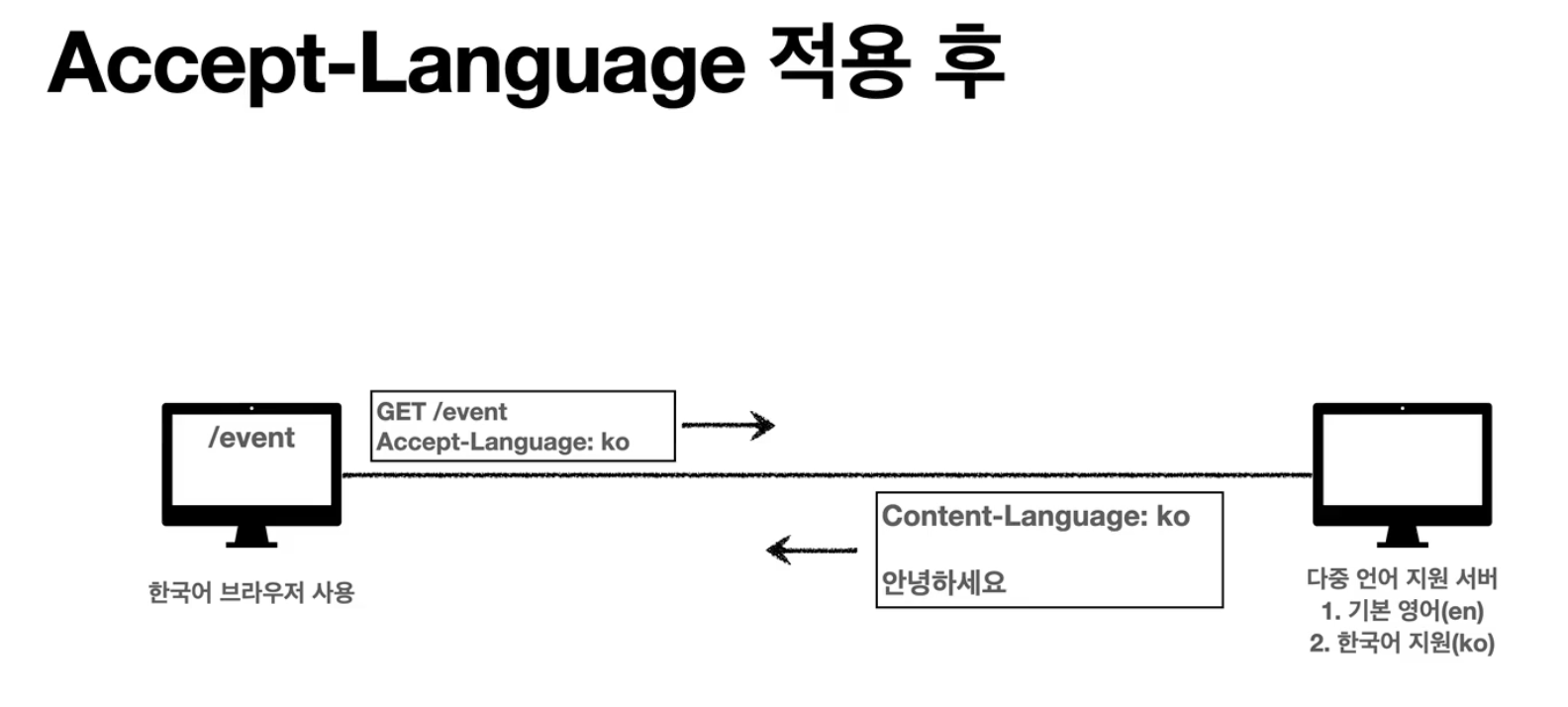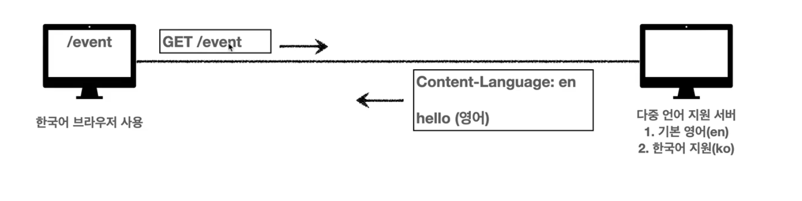 하지만 클라이언트가 서버 요청을 할때 Accept-Language:ko 하여 만약에 "내가 선호하는 언어는 ko에요"라고 말하면 서버는 기본이 영어지만 한국어도 지원하기 때문에 content-Language를 ko로 바꾸어 한국어로 응답해준다.