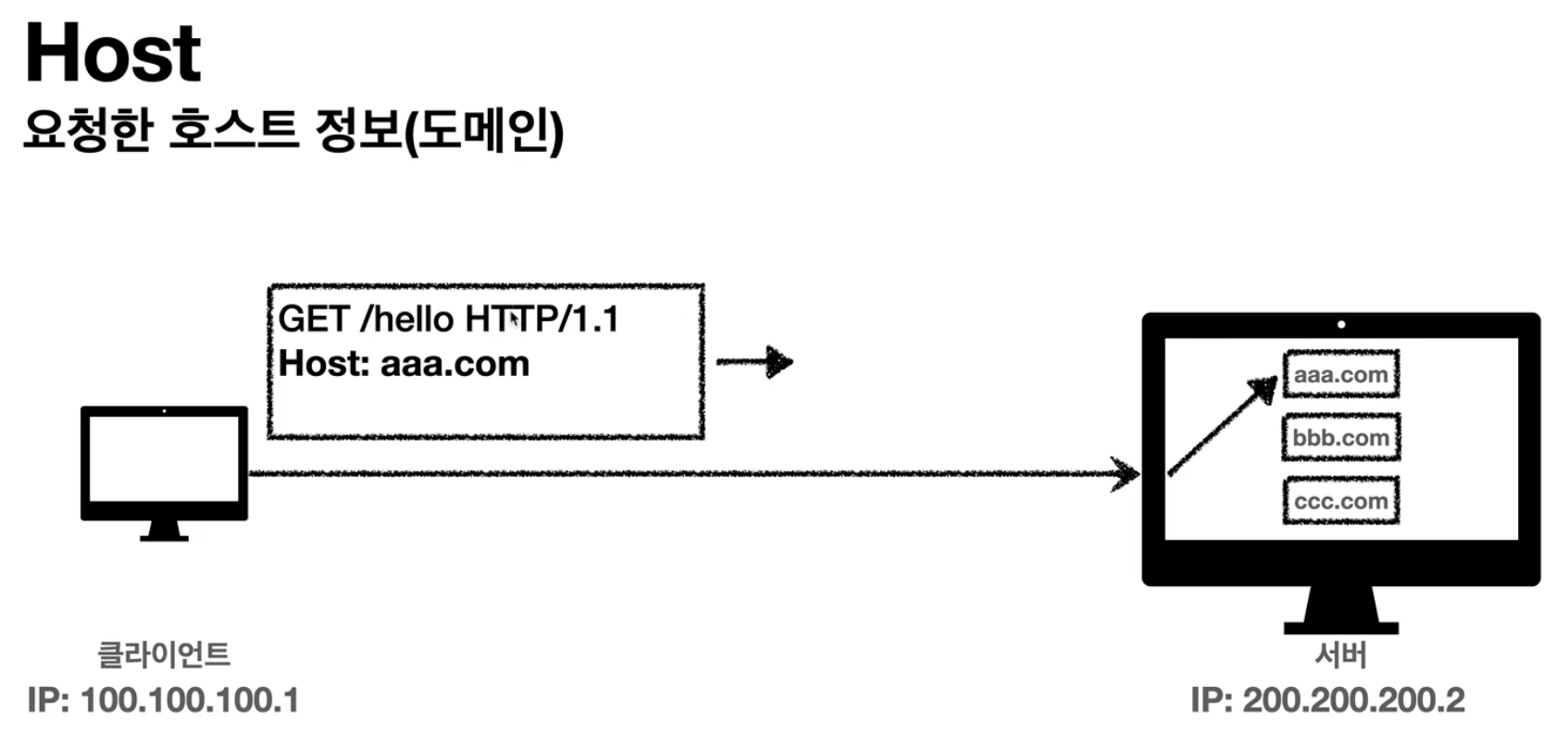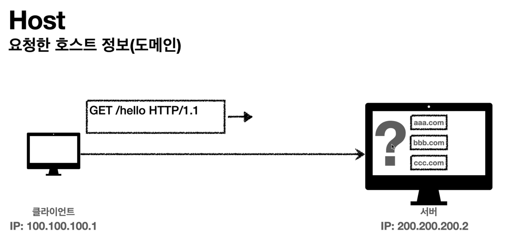 서버는 하나의 도메인만 처리하는 것이 아닌 여러 도메인을 처리할 수도 있다. 이때 클라이언트가 서버에 요청을 보냈을 때 서버가 여러 도메인을 가지고 있다면 클라이언트와 서버는 IP로만 통신하기에 서버는 클라이언트가 보낸 /hello가 aaa.com에 관련된 애플리케이션에 들어가야할지, bbb.com에 관련된 애플리케이션에 들어가야할지 구분 할 방법이 없다. 그래서 필수로 HTTP헤더에 host로 도메인을 넣어 서버가 구분을 할 수 있도록 만들어 준다.
