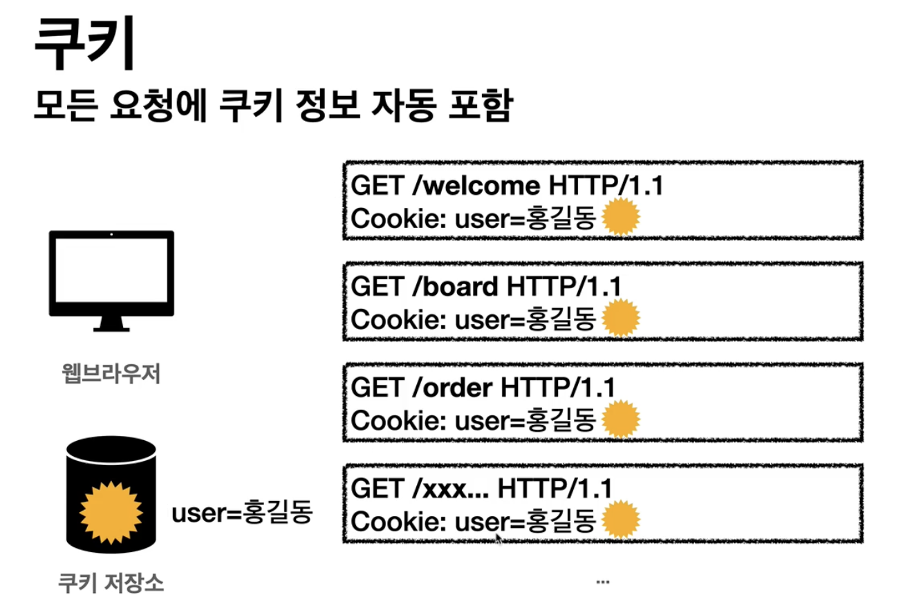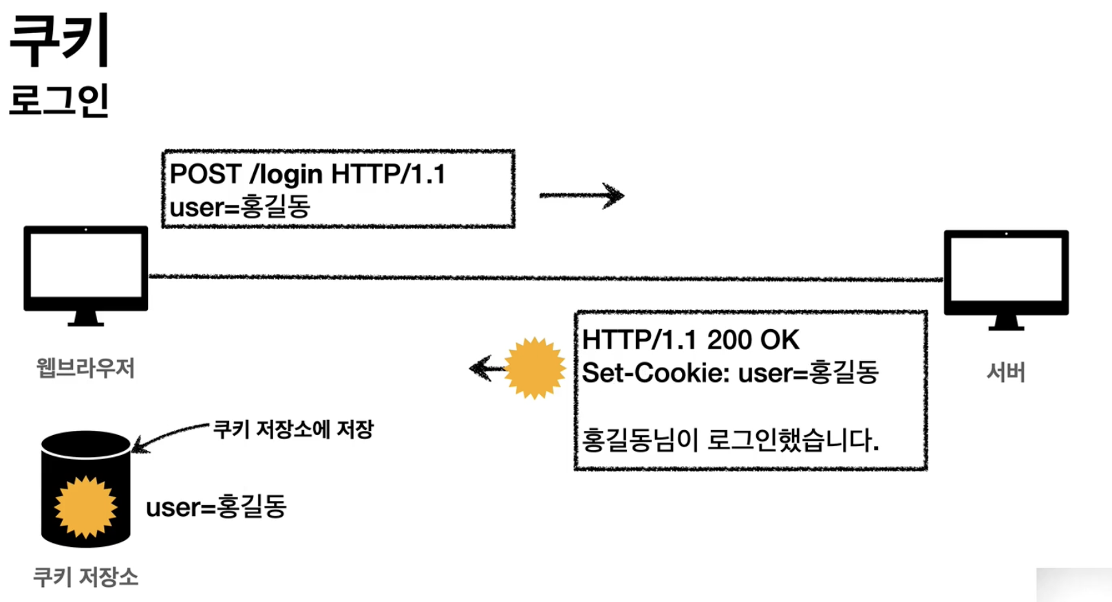 - 세션 쿠키: 만료 날짜를 생략하면 브라우저 종료시 까지만 유지 (웹 브라우저를 완전히 껐다가 키면 다시 로그인 해야되는 등의 예)