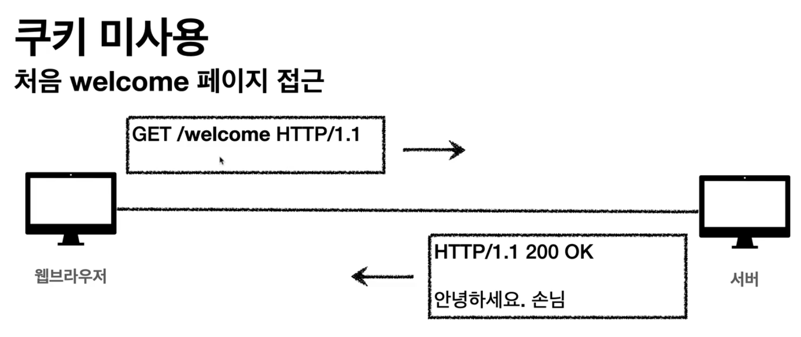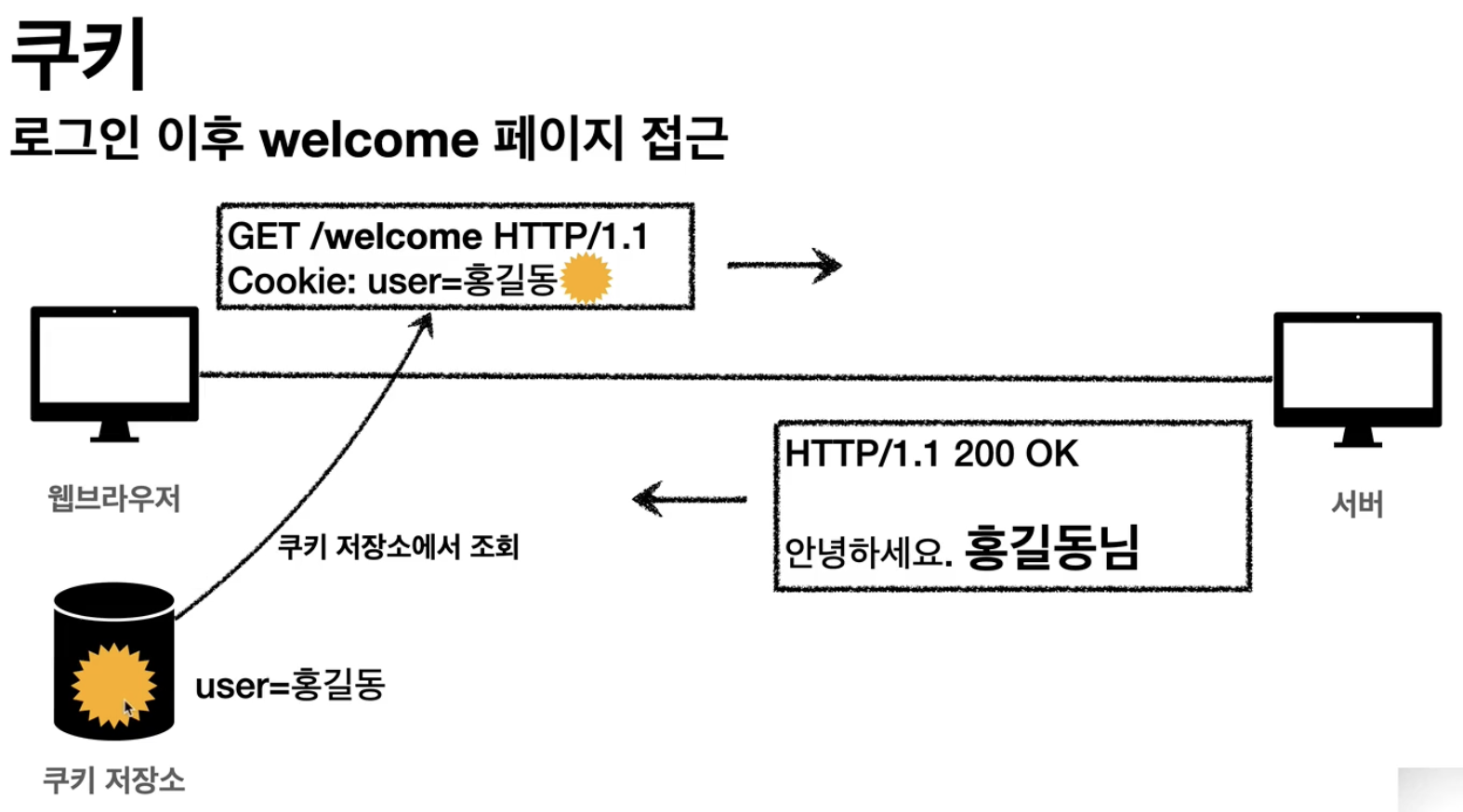 로그인 이후에 웹 브라우저가 welcome 브라우저에 들어가게 되면 자동으로 웹 브라우저는 이 서버에 요청을 할 때마다 쿠키 저장소를 무조건 뒤지고, 있으면 꺼내서 Cookie: user = 홍길동 이라는 http 헤더를 만들어서 서버에 보낸다. 그러면 서버는 쿠키를 열어서 유저가 홍길동 이라는 것을 알 수 있게 되어 "안녕하세요. 홍길동님"이라고 할 수 있는 것이다.