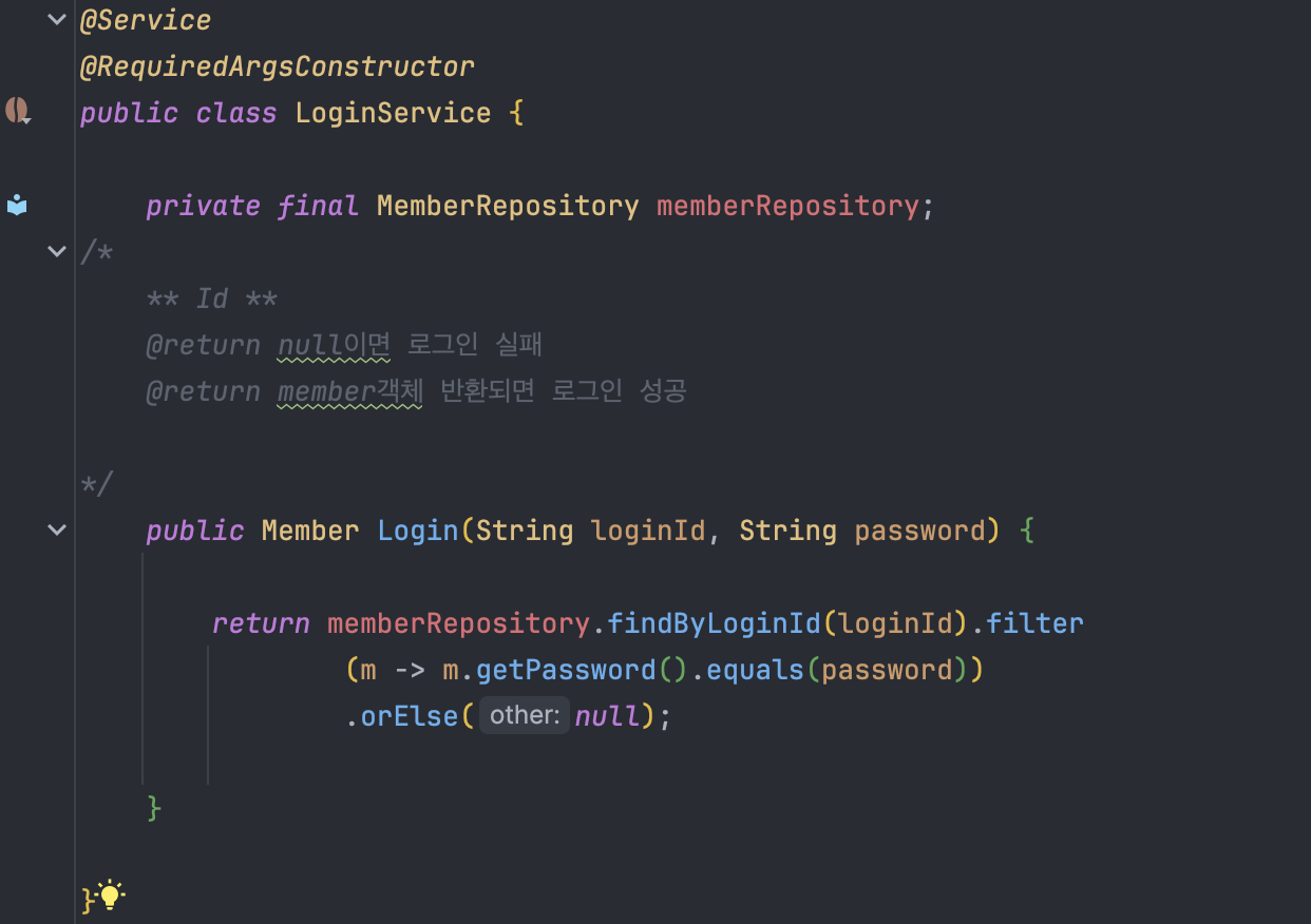 로그인의 핵심 비즈니스 로직은 회원을 조회한 다음에 파라미터로 넘어온 password와 비교해서 같으면 회원을 반환하고,