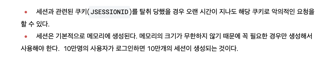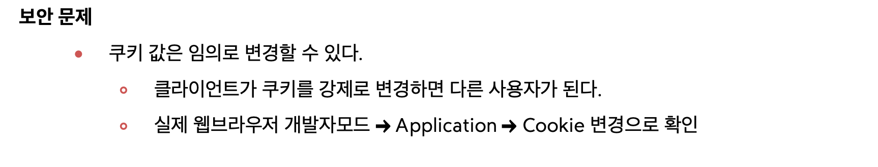 쿠키의 값은 임의로 변경할 수 있기 때문에, 클라이언트가 쿠키를 강제로 변경하면 다른 사용자가 되기 때문에, 보안상의 문제가 있다.