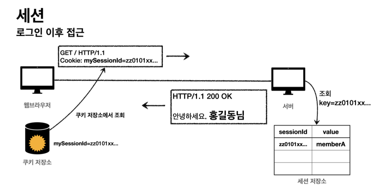 2) 서버에서는 클라이언트가 전달한 `mySessionId` 쿠키 정보로 세션 저장소를 조회해서 로그인시 보관한 세션 정보를 사용한다.