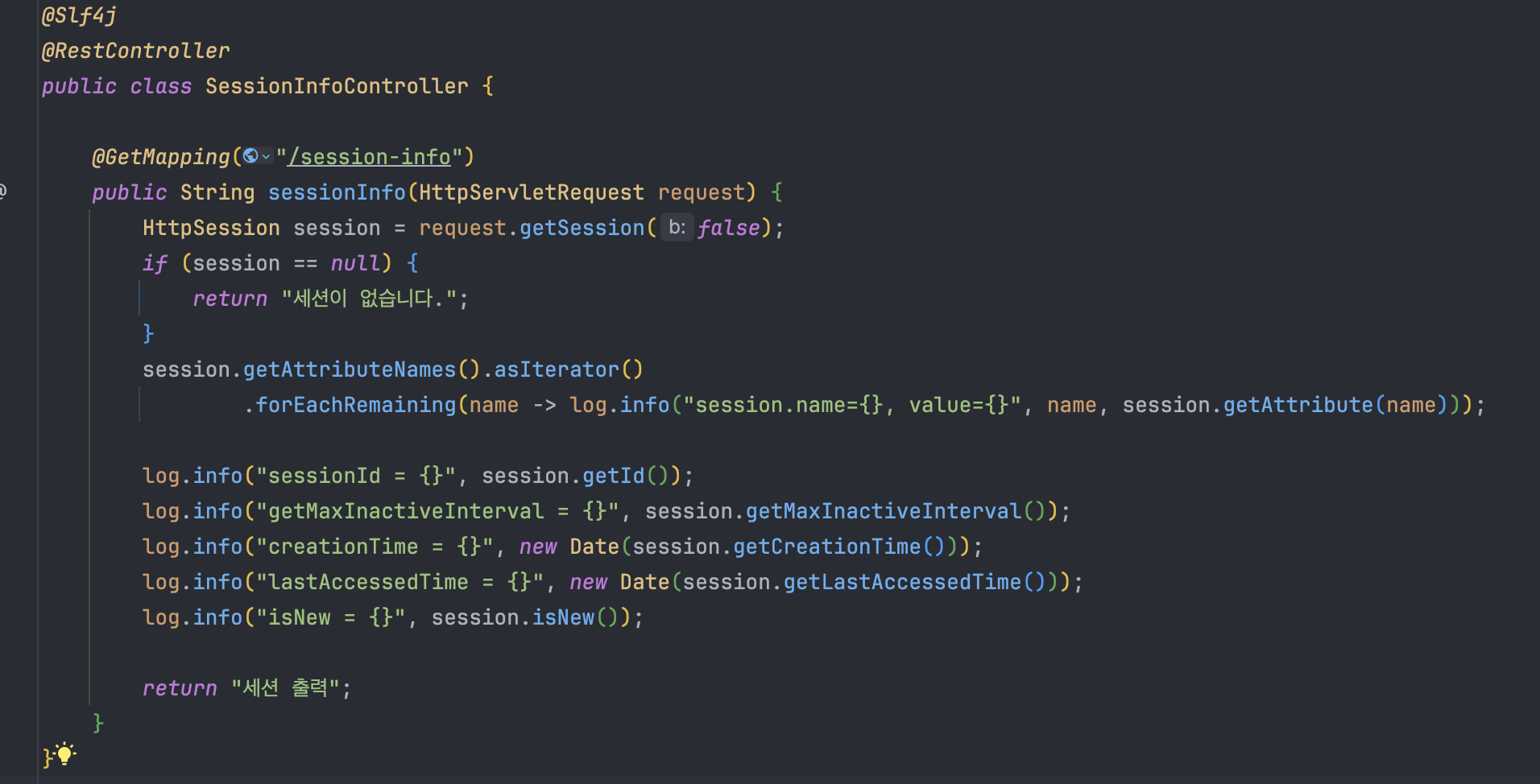 ㅇ 세션이 없으면 새로운 세션을 생성하지 않는다. `null` 을 반환한다.`request.getSession()` : 신규 세션을 생성하는 `request.getSession(true)` 와 동일하다.