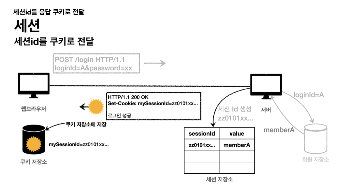 1)서버는 클라이언트에 `mySessionId` 라는 이름으로 세션ID 만 쿠키에 담아서 전달한다.