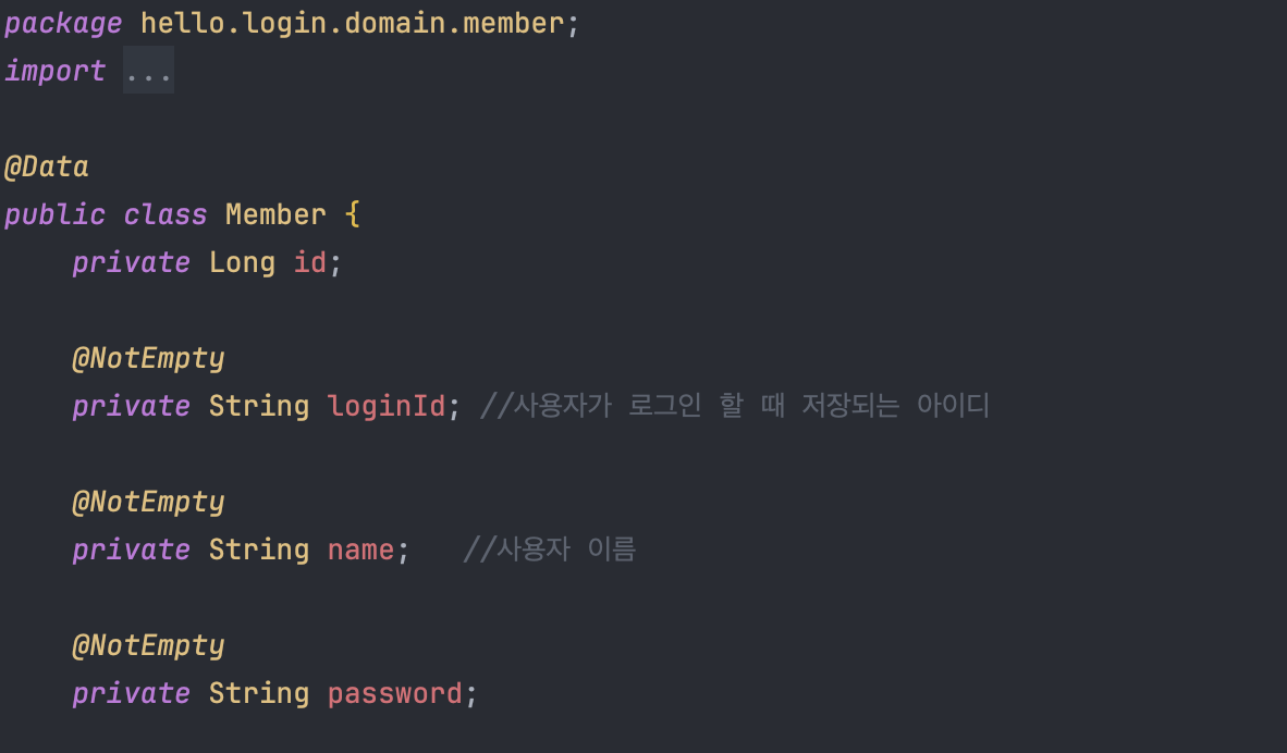 사용자가 로그인 할 때 저장되는 아이디값을 loginId, 사용자 이름을 name, 비밀번호를 password라는 변수로 생성해주었고,