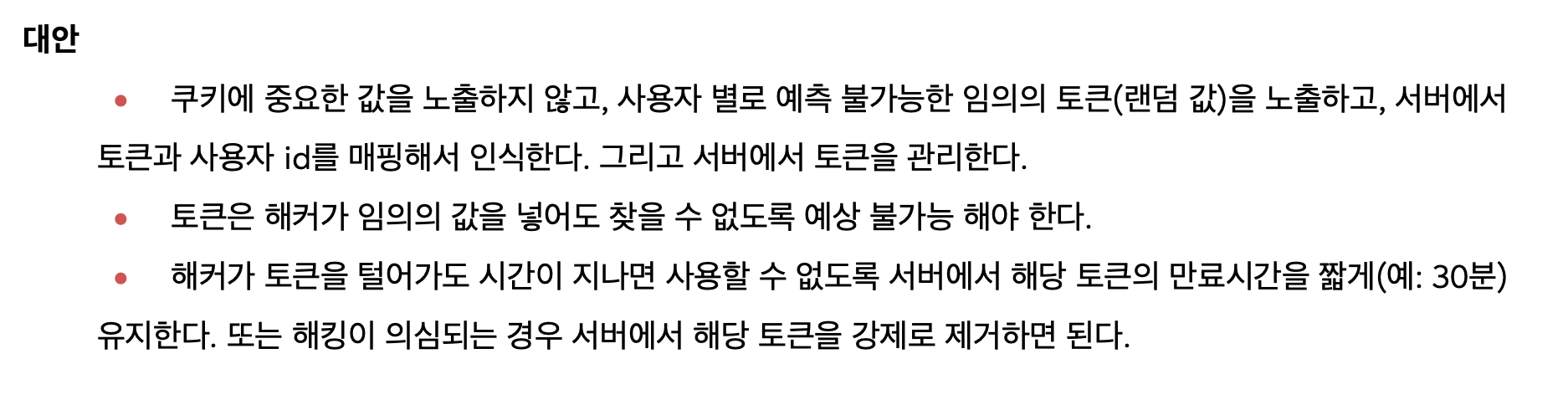 또한, 해커가 토큰을 털어도 시간이 지나면 사용할 수 없도록 서버에서 해당 토큰의 만료시간을 짧게(예: 30분) 유지한다.