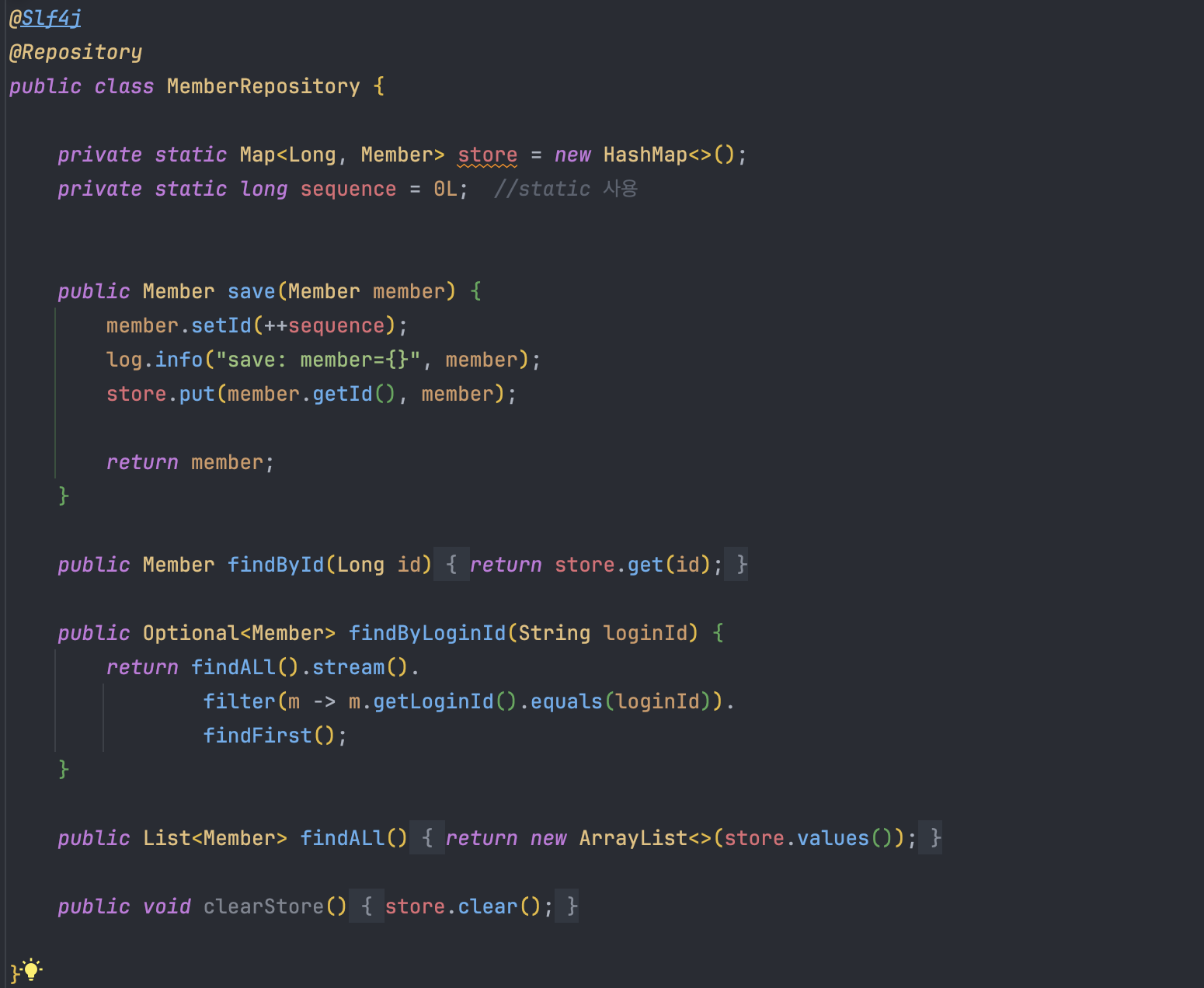 public Optional<Member> findByLoginId(String loginId) { return findALl().stream(). filter(m -> m.getLoginId().equals(loginId)). findFirst(); }