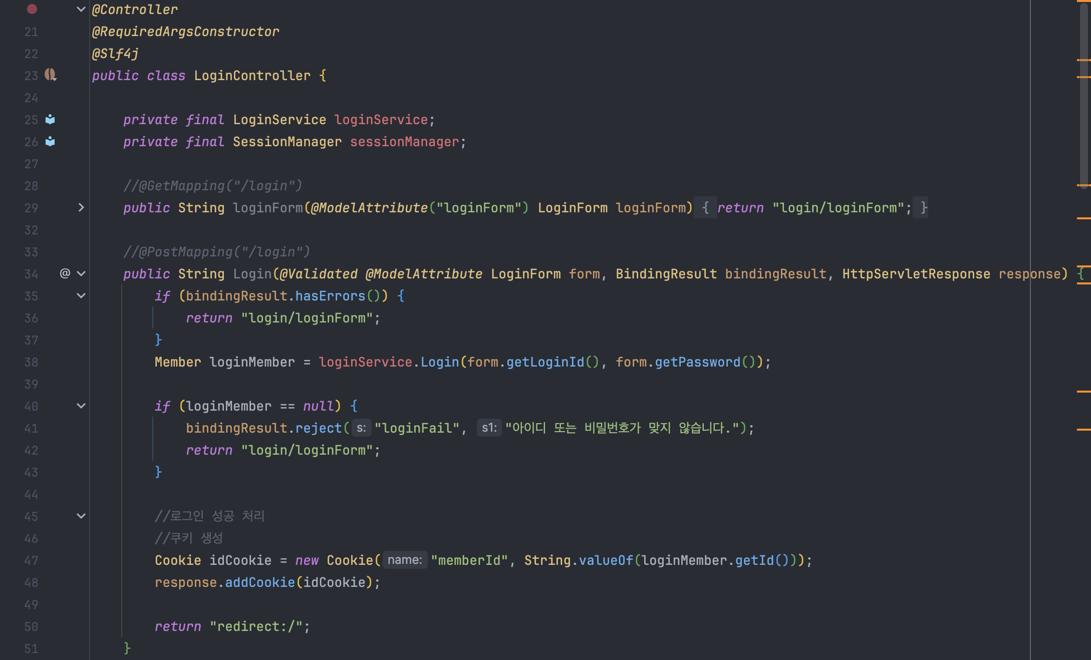 로그인 컨트롤러는 로그인 서비스를 호출해서 로그인에 성공하면 홈 화면으로 이동하고, 로그인에 실패하면 `bindingResult.reject()` 를 사용해서 글로벌 오류( `ObjectError` )를 생성한다.