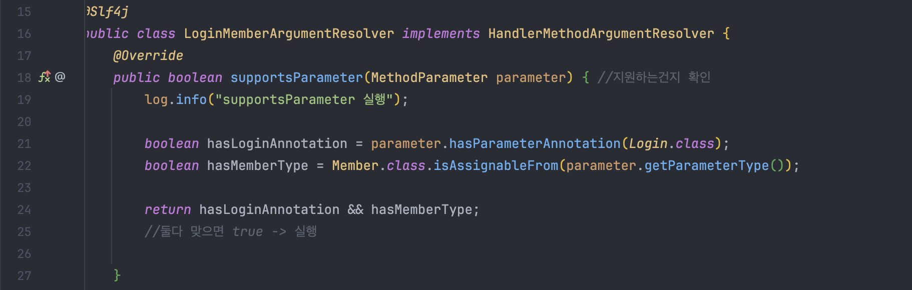 'boolean hasLoginAnnotation = parameter.hasParameterAnnotation(Login.class);'`supportsParameter()`: '@Login' 애노테이션이 있으면서 'Member' 타입이면 해당 'ArgumentResolver' 가 사용 됨