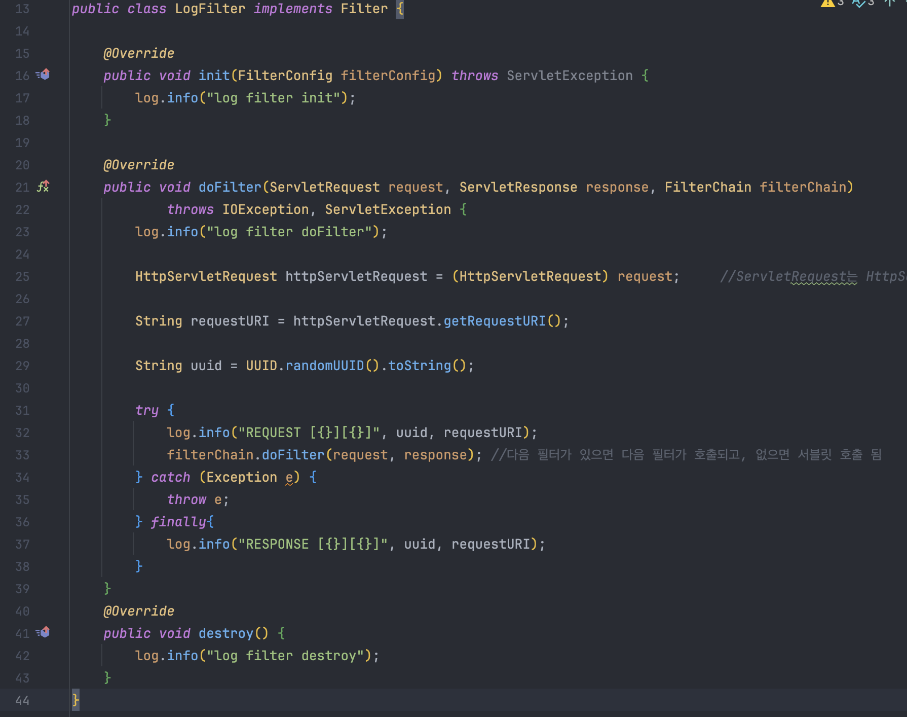 - 'init()': 필터 초기화 메서드, 서블릿 컨테이너가 생성될 때 호출된다