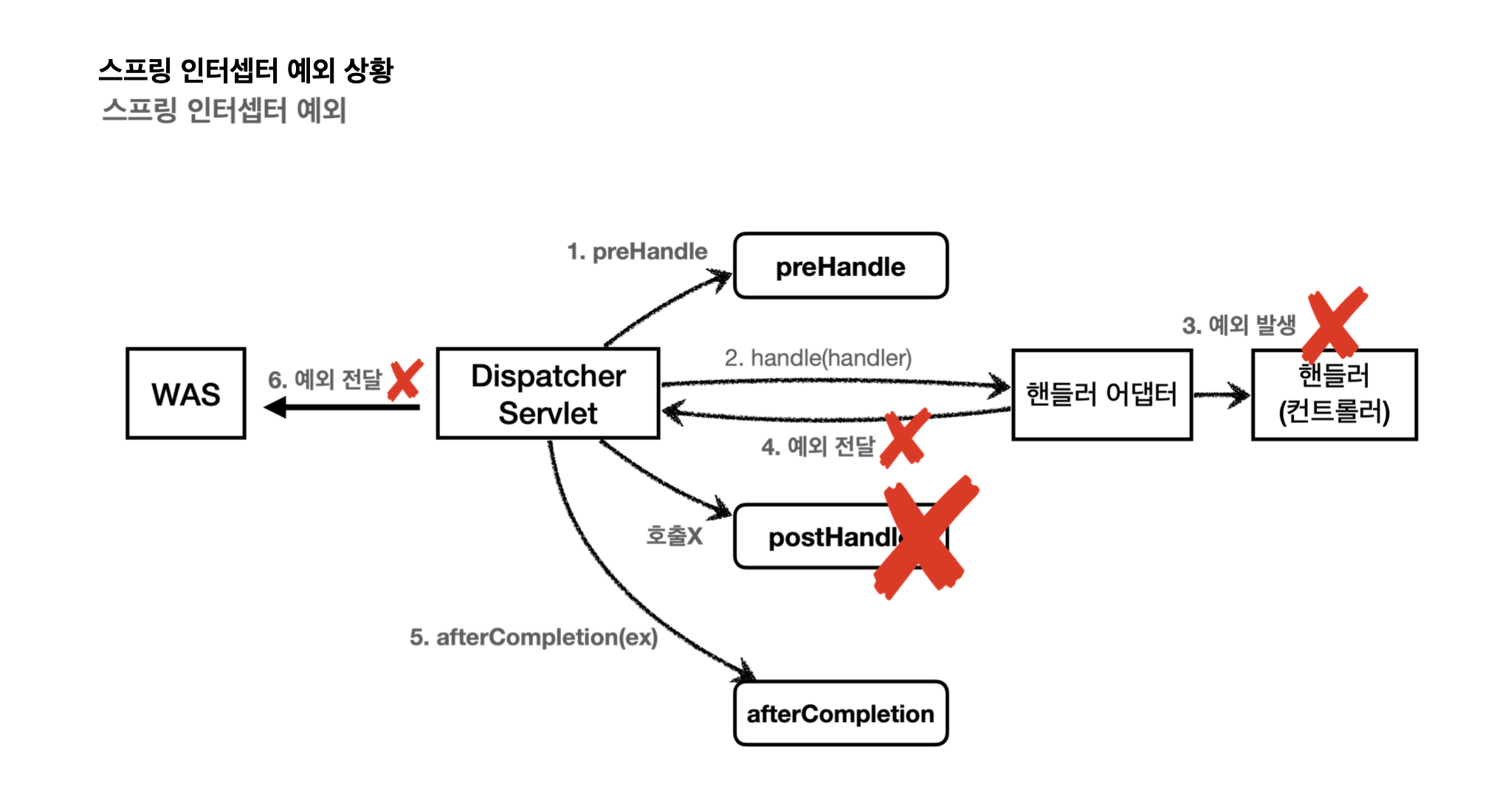 예외가 발생하면 `postHandle()` 는 호출되지 않으므로 예외와 무관하게 공통 처리를 하려면 `afterCompletion()` 을 사용해야 한다. 예외가 발생하면 `afterCompletion()` 에 예외 정보( `ex` )를 포함해서 호출된다.