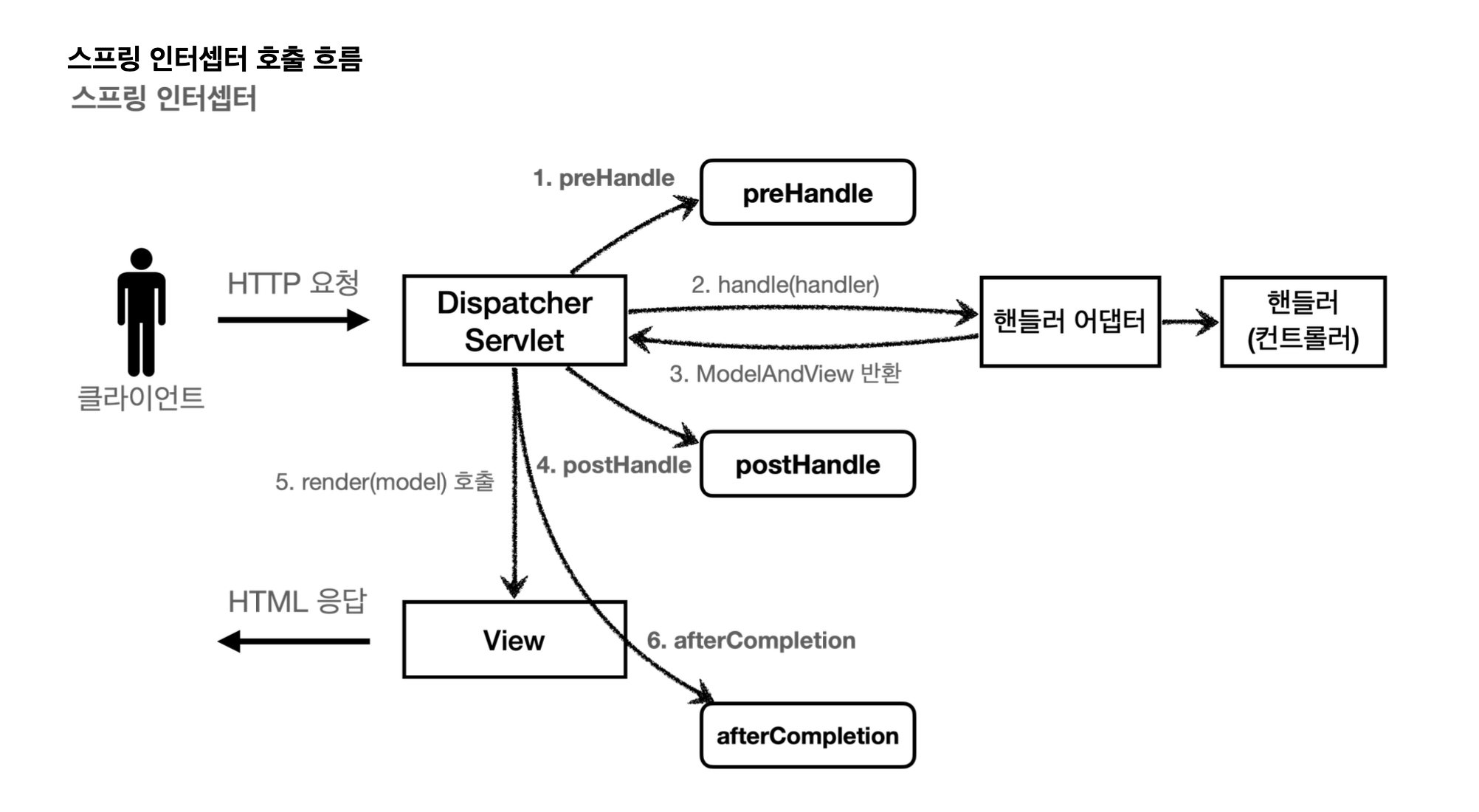 - 스프링 인터셉터는 디스패처 서블릿과 컨트롤러 사이에서 컨트롤러 호출 직전에 호출 된다.