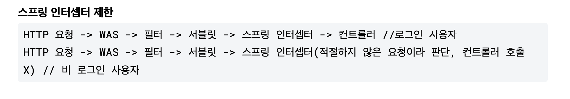필터와 비교해보면 인터셉터는 `addPathPatterns` , `excludePathPatterns` 로 매우 정밀하게 URL 패턴을 지정 할 수 있다.