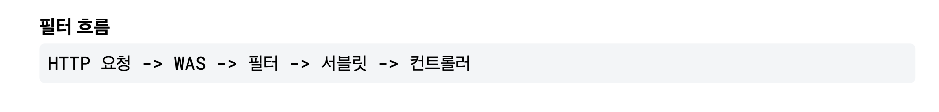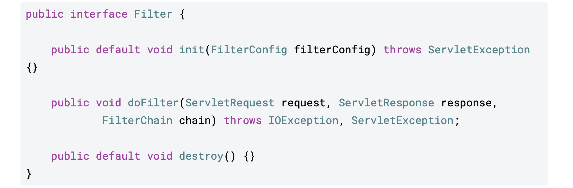 - 'destroy()': 필터 종료 메서드, 서블릿 컨테이너가 종료될 때 호출된다.
