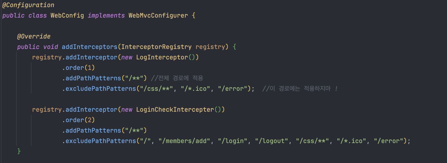 4) `excludePathPatterns("/css/**", "/*.ico", "/error")` : 인터셉터에서 제외할 패턴을 지정한다.