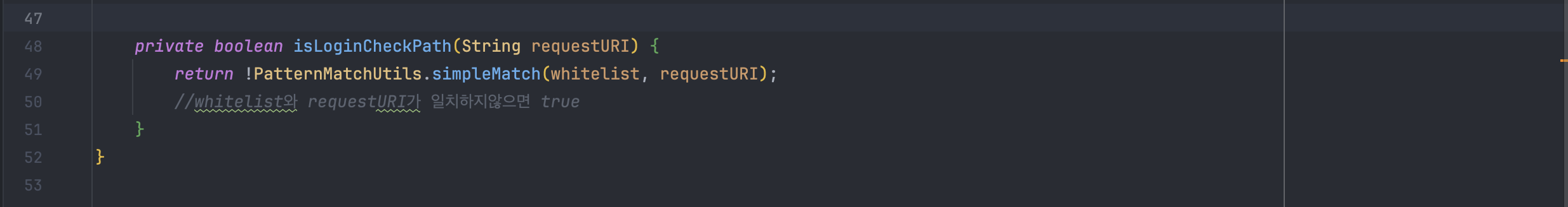 이렇게 화이트 리스트 경로는 인증과 무관하게 항상 허용한 뒤, 화이트 리스트를 제외한 모든 경로에는 인증 체크 로직을 적용
