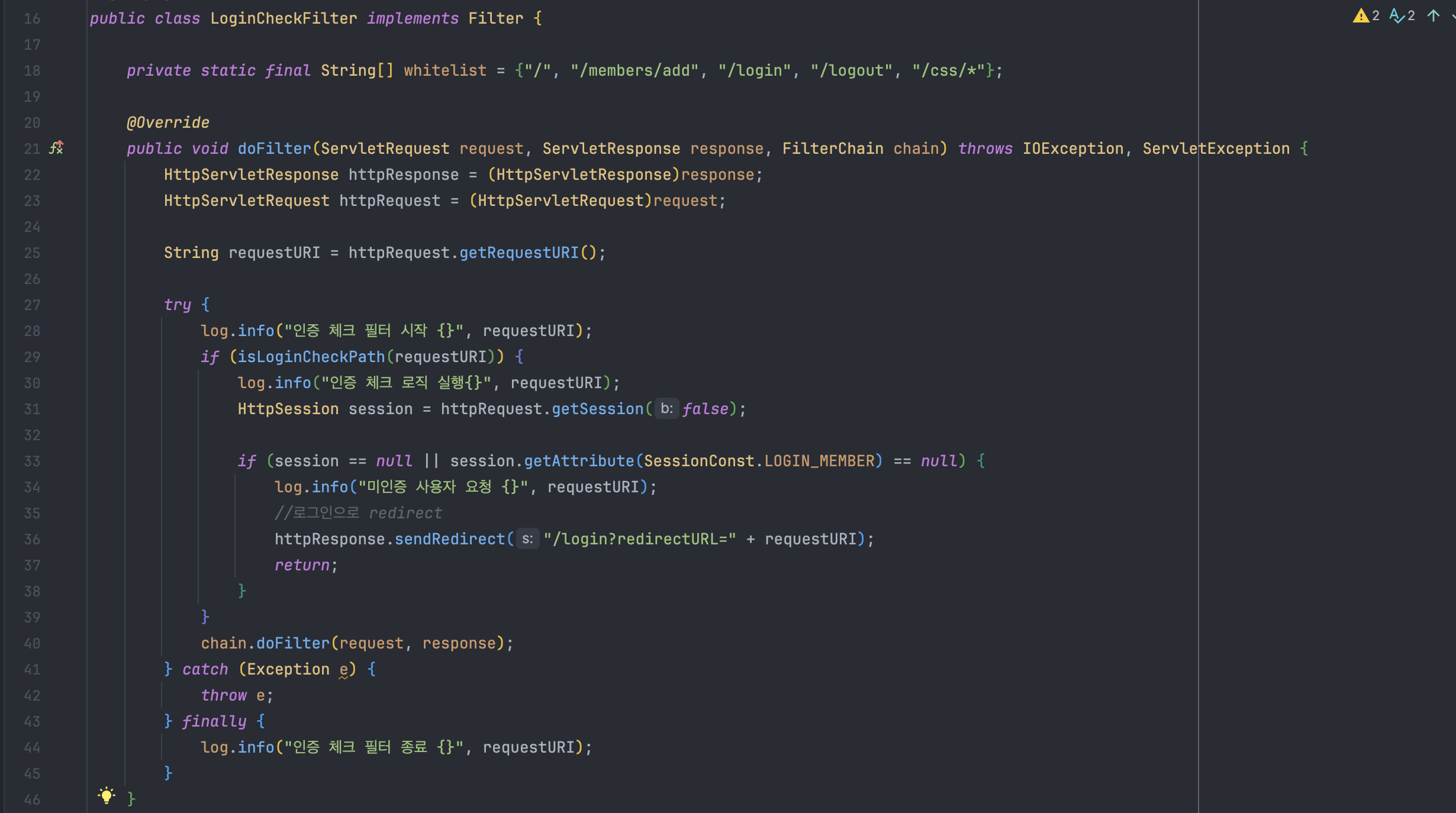 필터에서 적절하지 않은 요청이라고 판단하면 거기에서 끝을 낼 수도 있다. 그래서 로그인 여부를 체크하기에 딱 좋다.