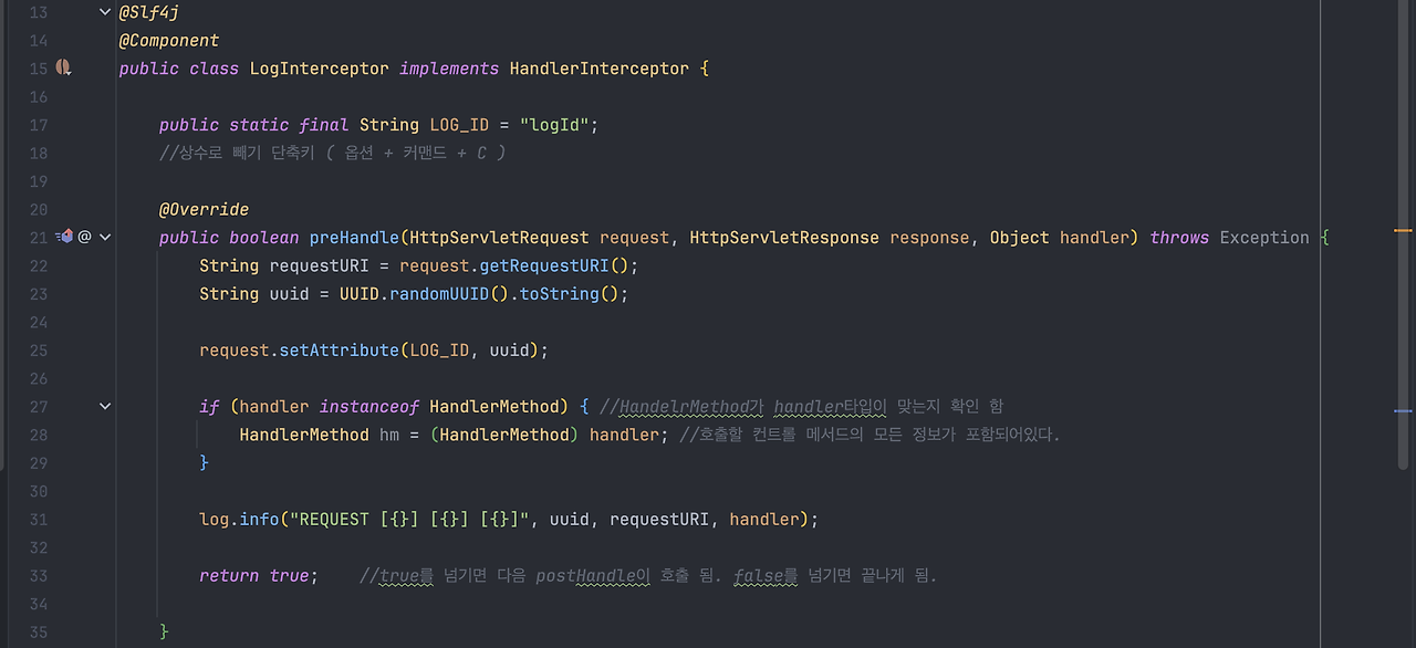 따라서 `preHandle` 에서 지정한 값을 `postHandle` , `afterCompletion` 에서 함께 사용하려면 어딘가에 담아두어야 한다.`LogInterceptor` 도 싱글톤 처럼 사용되기 때문에 맴버변수를 사용하면 위험 하다.