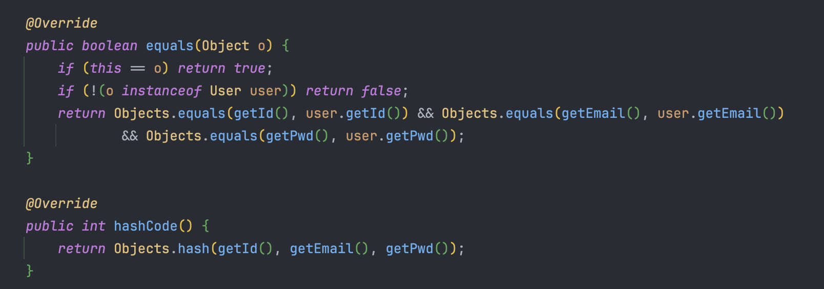 - 객체의 필드 값을 기준으로 비교하며, 두 객체의 필드 값이 모두 같으면 true를 반환한다.