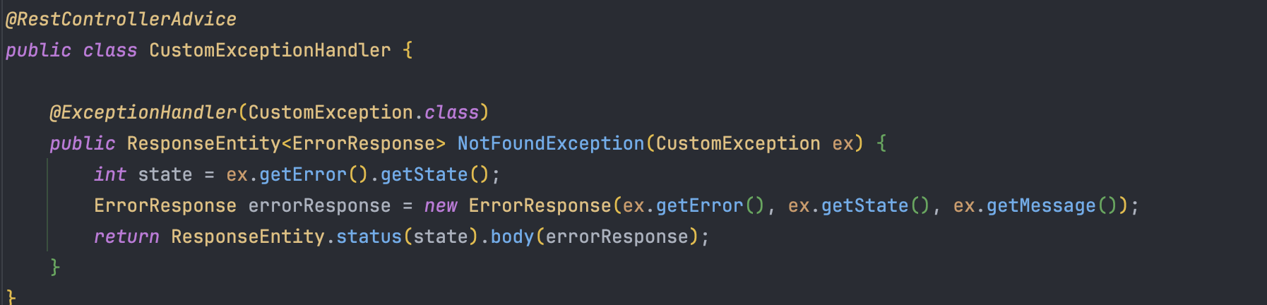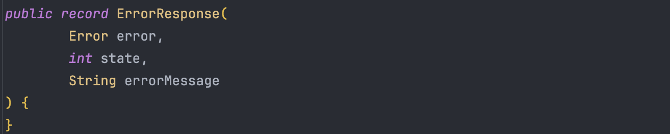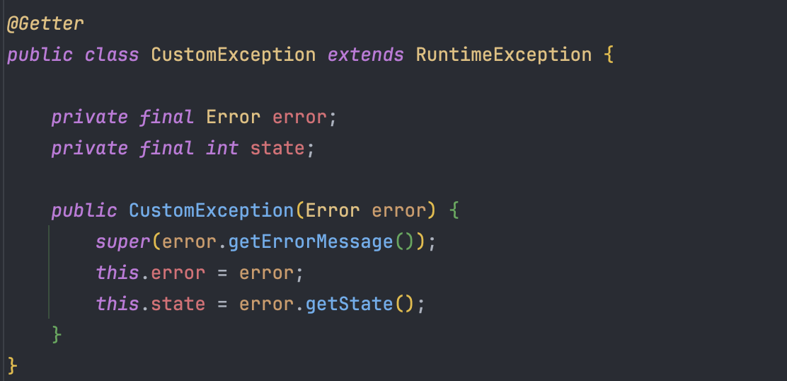 * 사실 error enum안에 state 필드가 있어 굳이 CustomException클래스에서 state 필드를 받지않고, CustomException에서 ErrorResponse를 만들 때 ex.getError().getState()를 하면 되는데 CustomException 코드가 길어지는 게 싫어서 여기서 필드로 받았다..~~ *
