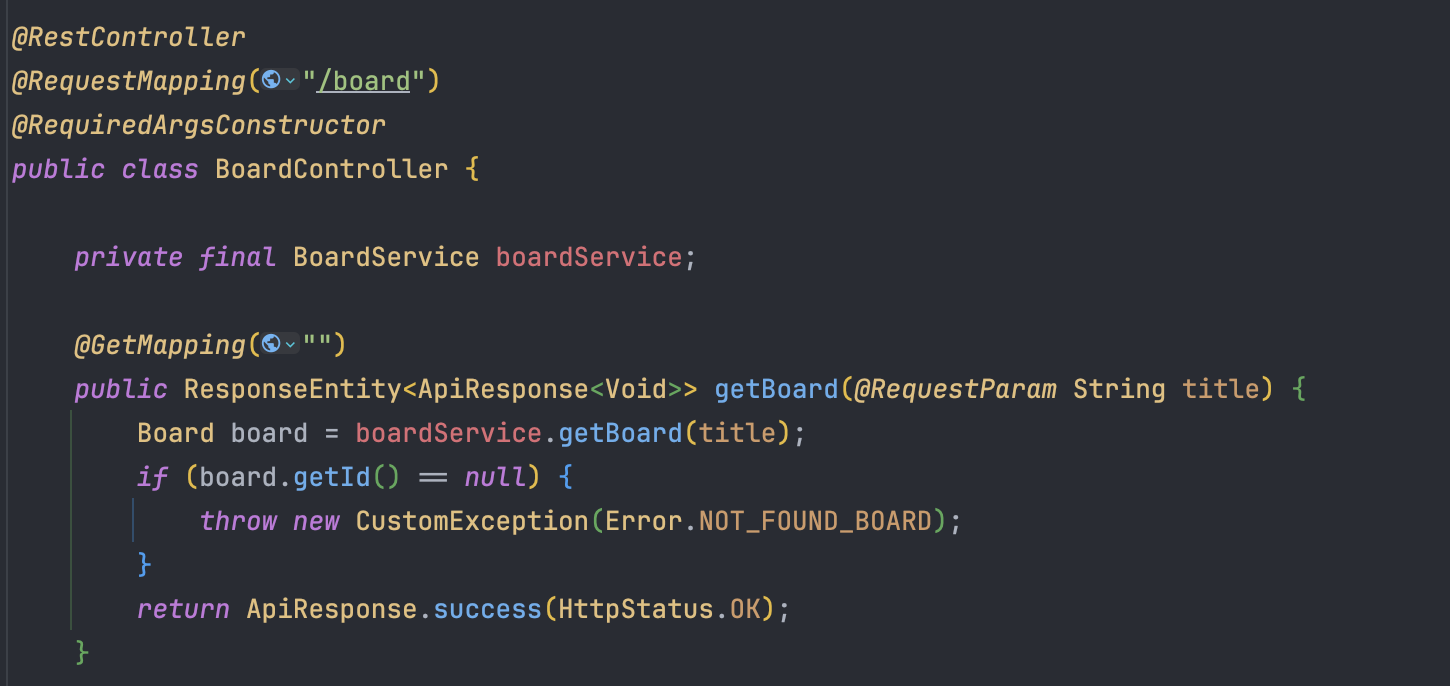 BoardController에서 제목으로 Board를 찾아왔을때 board값이 null이라면 CustomException 예외가 터지도록 하였다.