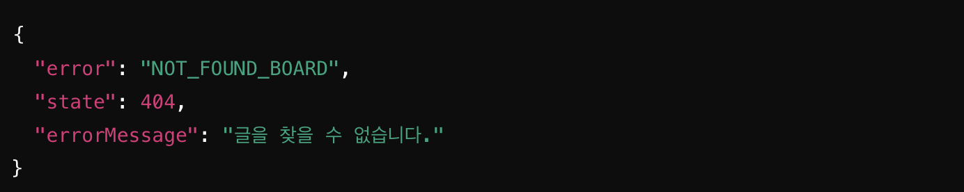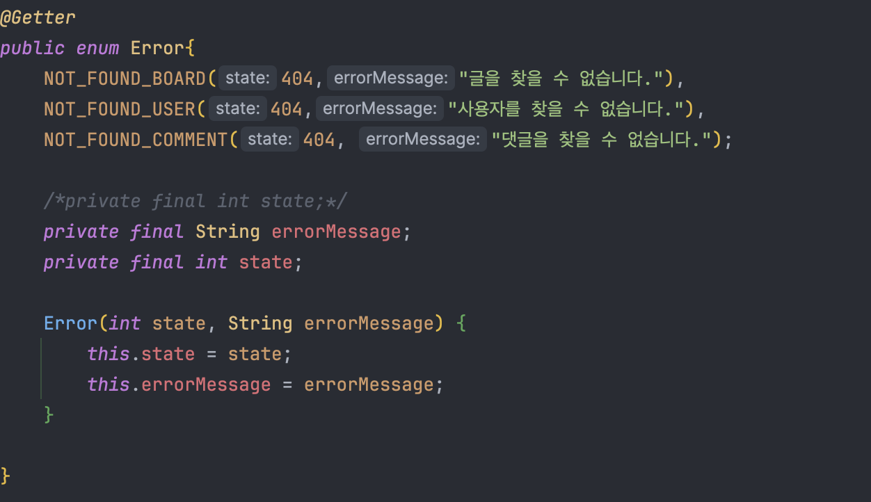 매개변수값으로는 위에 정의한 Enum중 글이 없다는 errorMessage가 담긴 NOT_FOUND_BOARD를 넣어주었다.