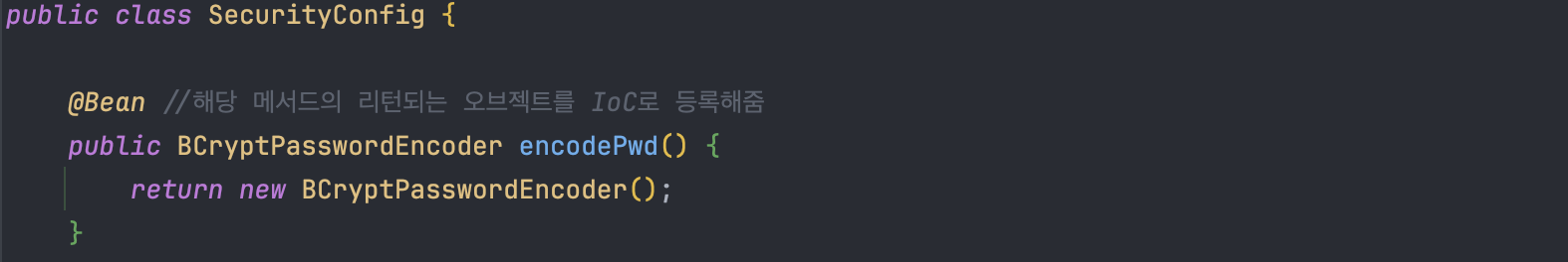 SecurityConfig에 BCryptPasswordEncoder객체를 생성하여 반환해주는 encodePwd라는 메서드를 생성하여 스프링 빈을 생성