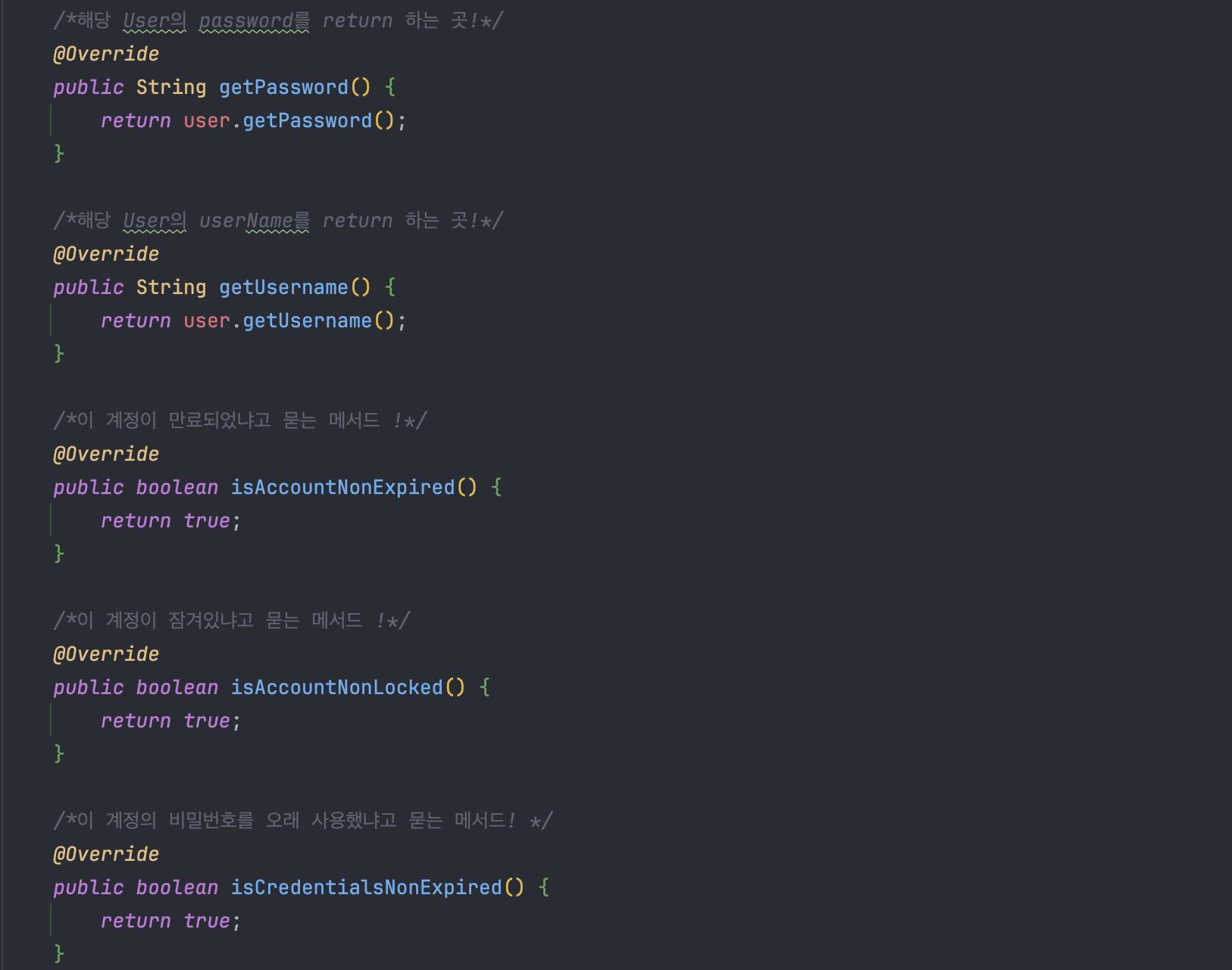 - UserDetails: Authentication 객체 내부에 포함되어, 인증된 사용자의 정보를 제공하는 객체이다.