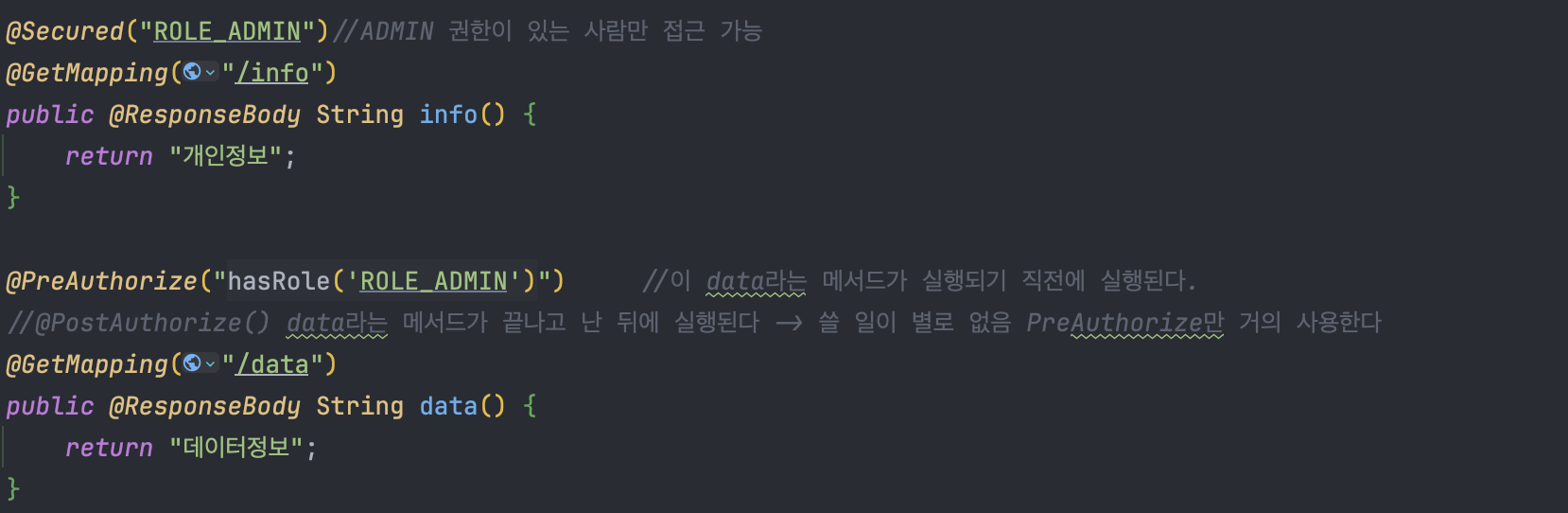 Security 설정 클래스에 @EnableGlobalMethodSecurity (securedEnable = true, prePostEnabled = true) 애노테이션을 추가한 뒤, 아래와 같이 Contorller에서 두개의 메서드를 생성해주었다.