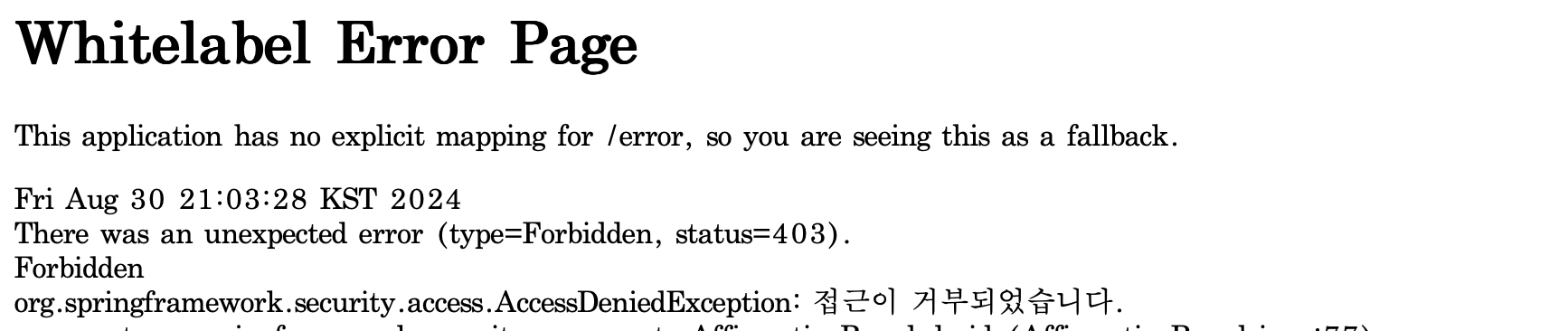 User 권한을 가진 사용자와 Manager 권한을 가진 사용자 모두 Admin 권한이 주어진 사용자만 접근가능한 info, data URL에 접근하자 403 상태코드가 또는 것을 확인할 수 있었다. (status=403. 접근이 거부되었습니다.)