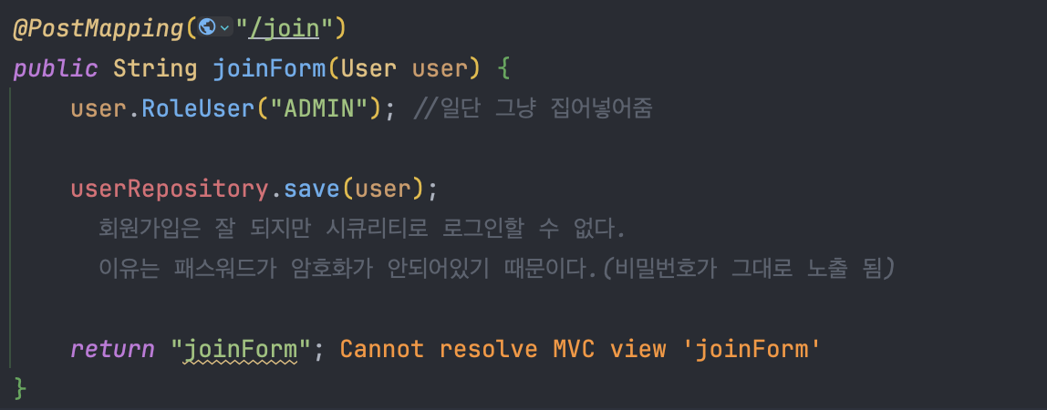 이렇게 코드를 작성할 경우, 회원가입은 잘 되지만 패스워드가 암호화 되어있지않기 때문에 비밀번호가 그대로 노출되어 Spring의 시큐리티를 이용하여 로그인할 수 없다.