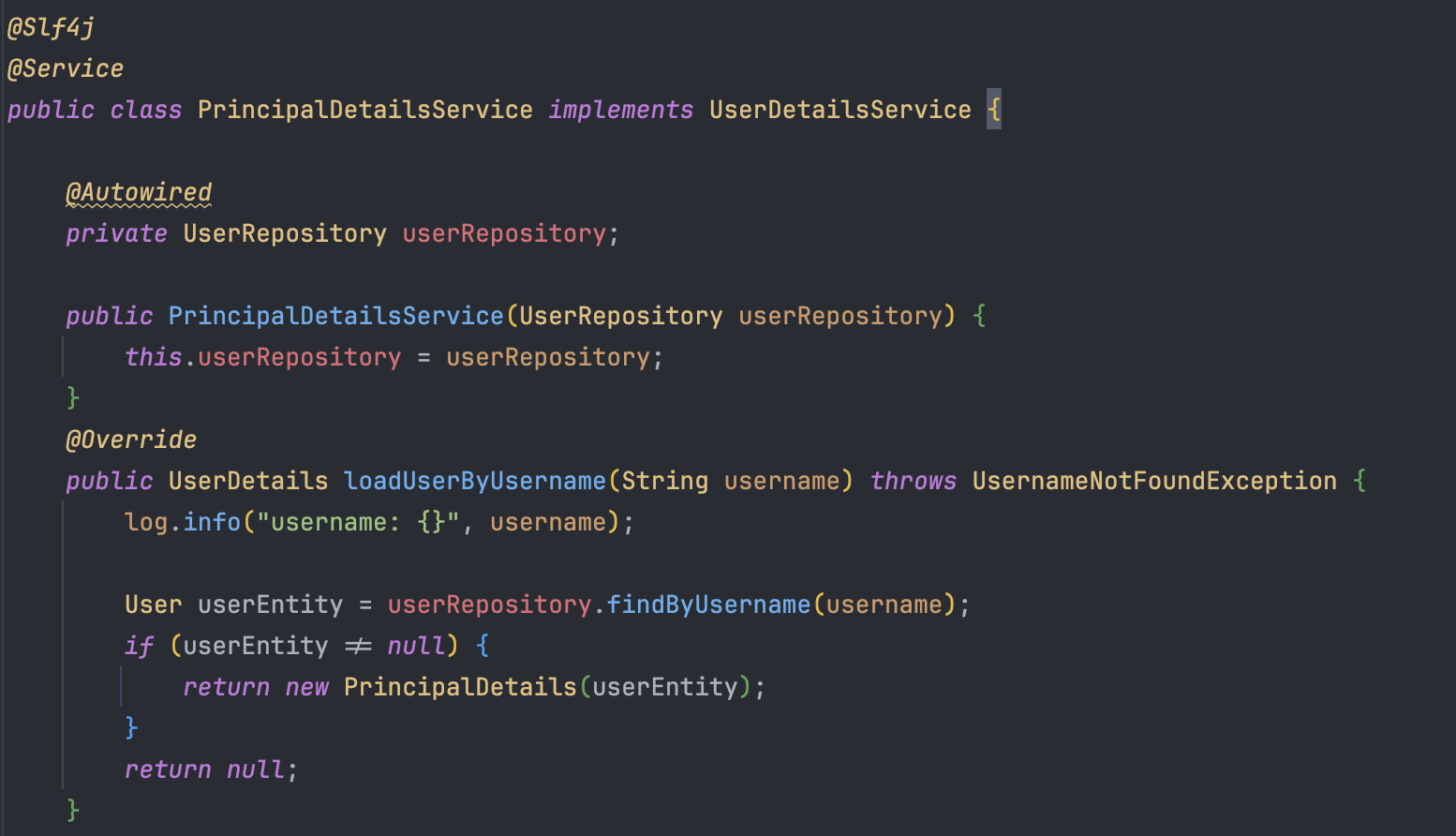 - UserDetailsService: 사용자 이름을 기반으로 "userDetails"객체를 로드하여 반환하는 역할을 한다. 로그인 과정에서 호출된다.