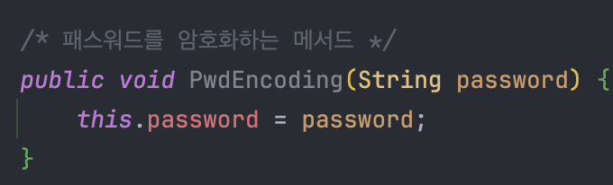 파라미터로 받아온 사용자의 정보에서 비밀번호를 가져와 bCryptPasswordEncoder를 통해 encode해주어 저장했다.