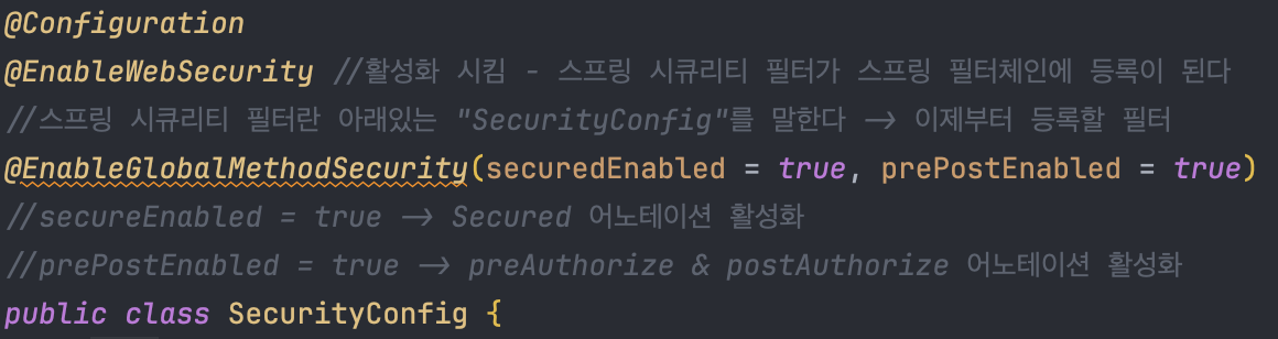 :Spring Security를 활성화하는 애노테이션이다. 이를 통해 Spring Security의 기본 필터 체인이 활성화되고, 이 클래스의 설정이 Spring Security 설정에 반영된다.