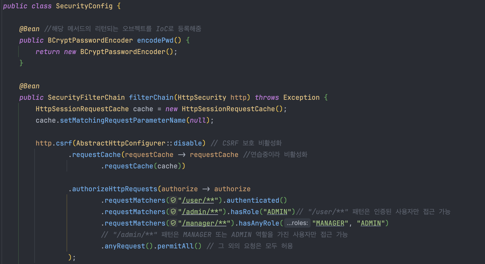 - SecurityConfig의 역할: 애플리케이션의 보안 설정을 담당