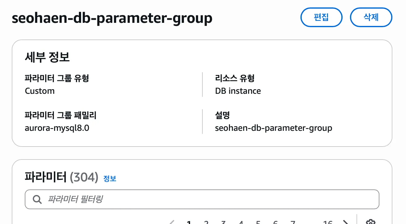 이와같이 파라미터 그룹도 RDB 설정값을 파라미터 그룹이라는 것을 활용해서 화면에서 옵션 값을 설정할 수 있도록 만든 것이다.