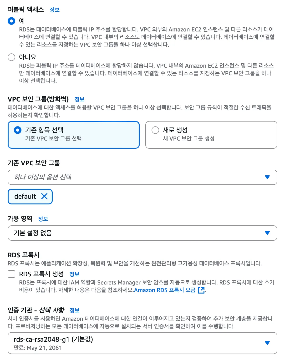 나중에 보안에 조금 더 신경써서 구성하고 싶을 때는 퍼블릭 액세스를 아니오로 체크하고 RDS를 만들 때도 있다.